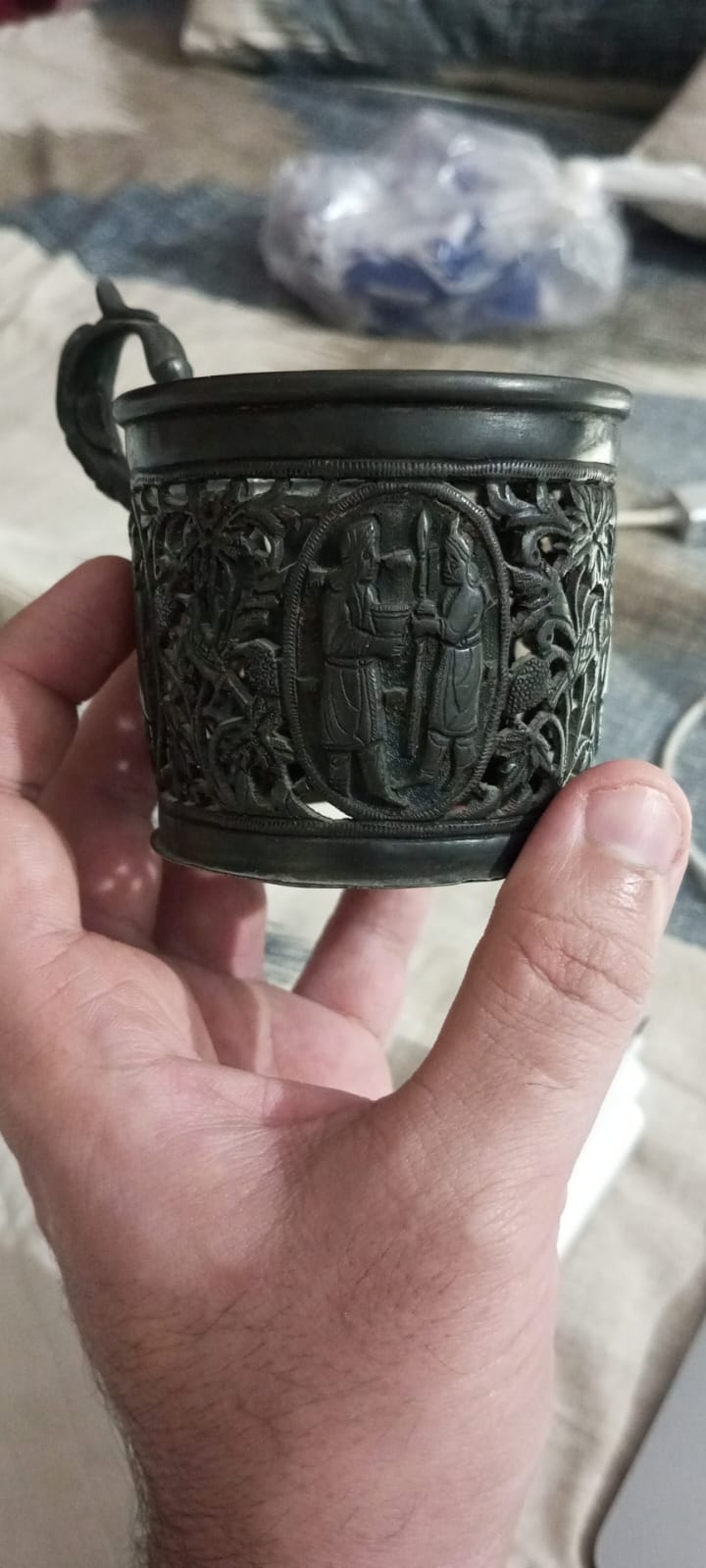 I have an antique Russian silver podstakannik/cup with beautiful pierced openwork body, figural courtly scenes in oval medallions, and intricate floral scrollwork with birds. Believed to be Imperial Russian period