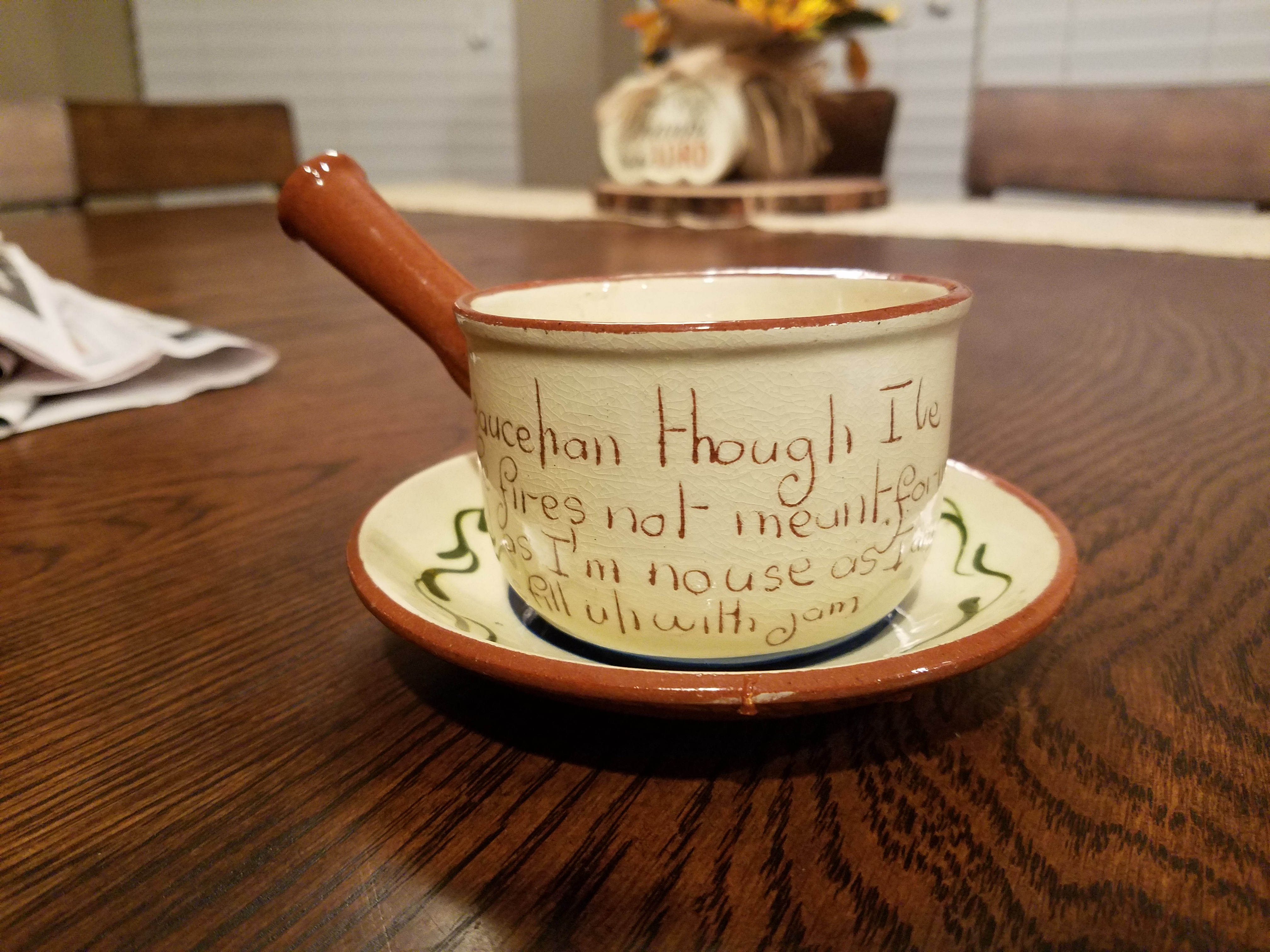 Not sure what the exact title is to this piece of pottery that I found in my great grandparents house.The writing is somewhat illiterate on cup says made in England on the bottom. Any info at all would be greatly appreciated
