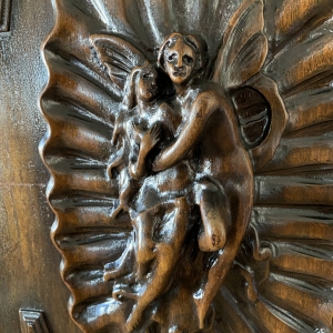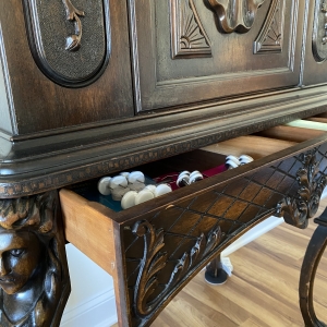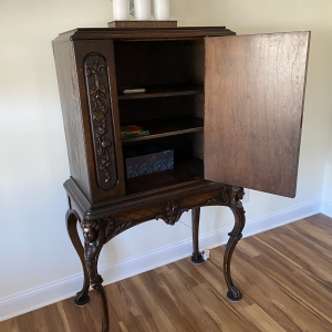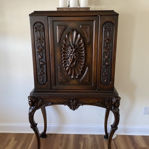 Dark veneered wooden cabinet. Purchased at an antique shop and they said it came from an old house in Saugerties, NY. It has a drawer underneath...