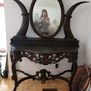 I photographed the last pic to show that the top piece is completely removable. The top piece consisting of the mirror, two drawers and the horns...