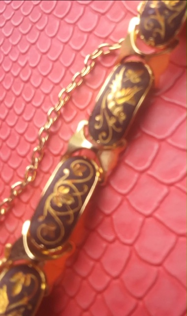 The scarab bracelet looks like a glass copy of the gold-filled and real stone ones that were everywhere in the 50s and 60s. The one that looks like rose quartz might actually be. I can't tell from here.
