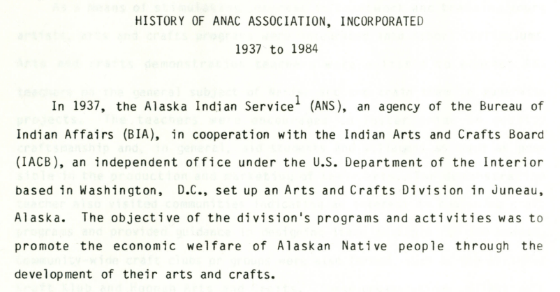 I have found that ANAC stands for the Alaska Native Arts and Crafts Association or Cooperative. They adopted the logo trademark that appears on the paper in 1949, and have continued to exist in some form at least up until 1984. Based on the use of the mimeograph, I would place the date of this pole somewhere in the mid twentieth century.