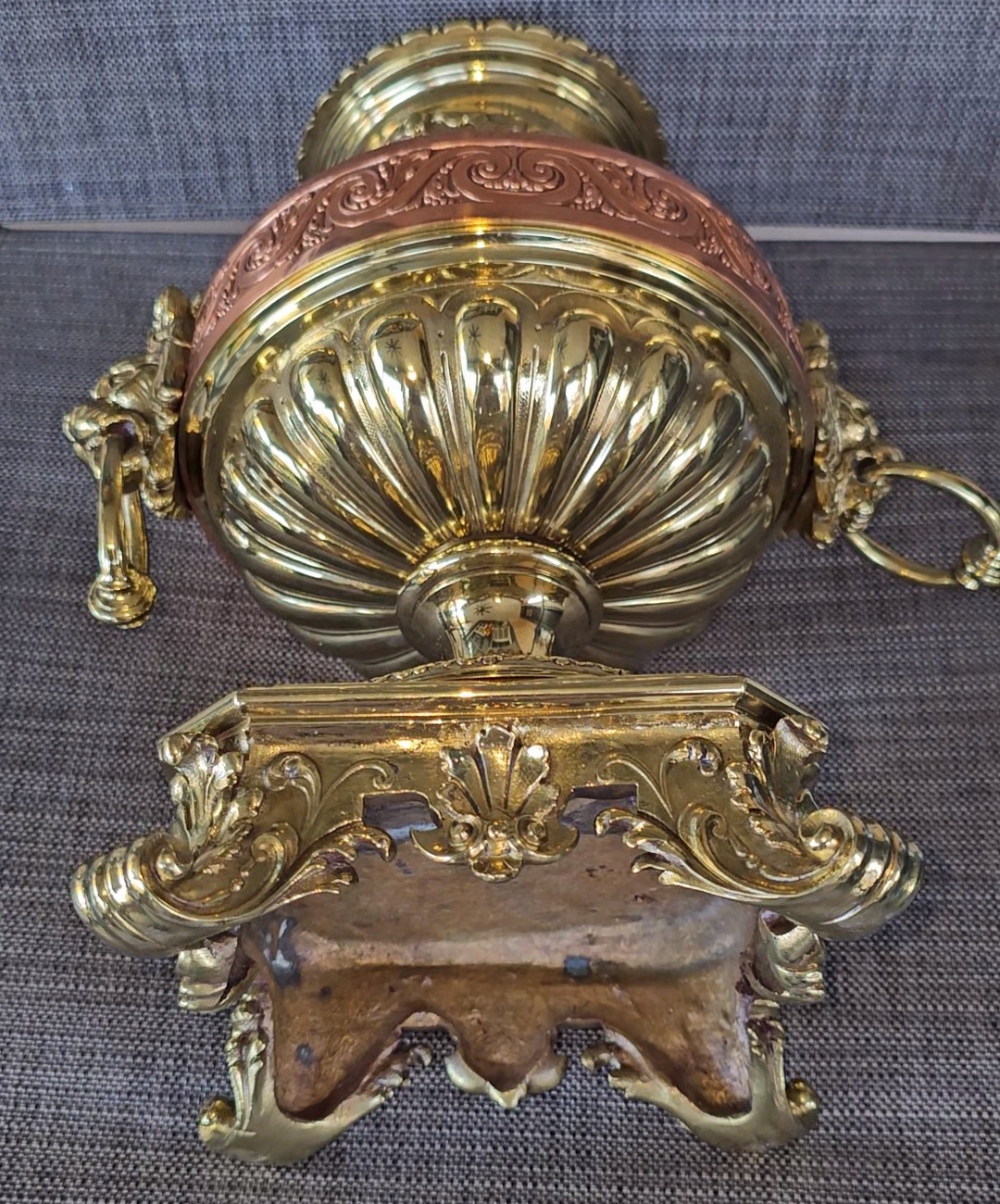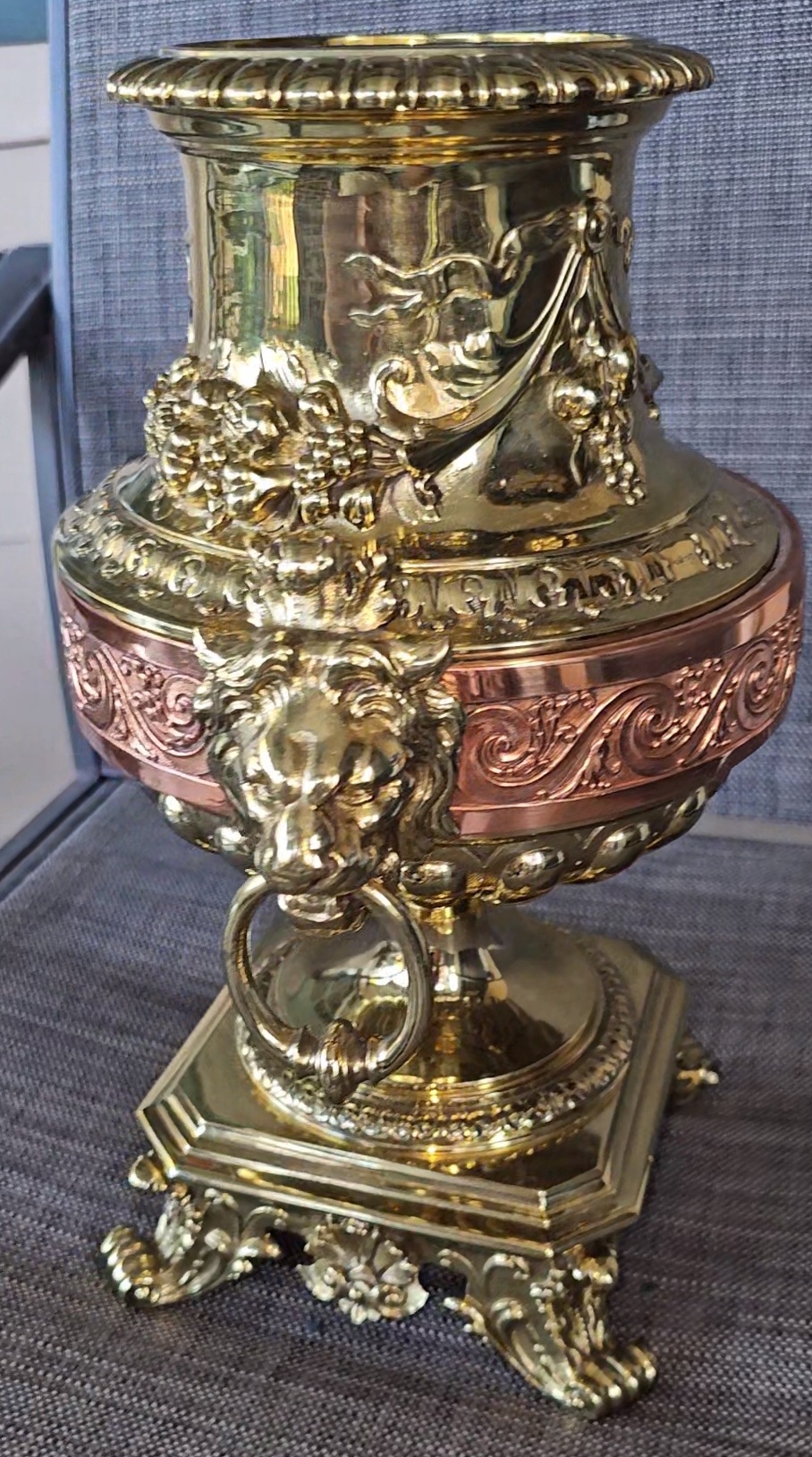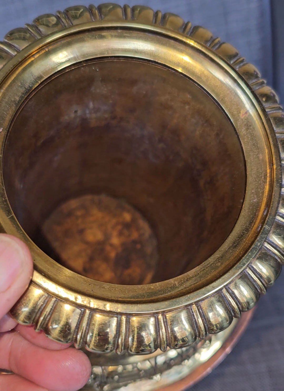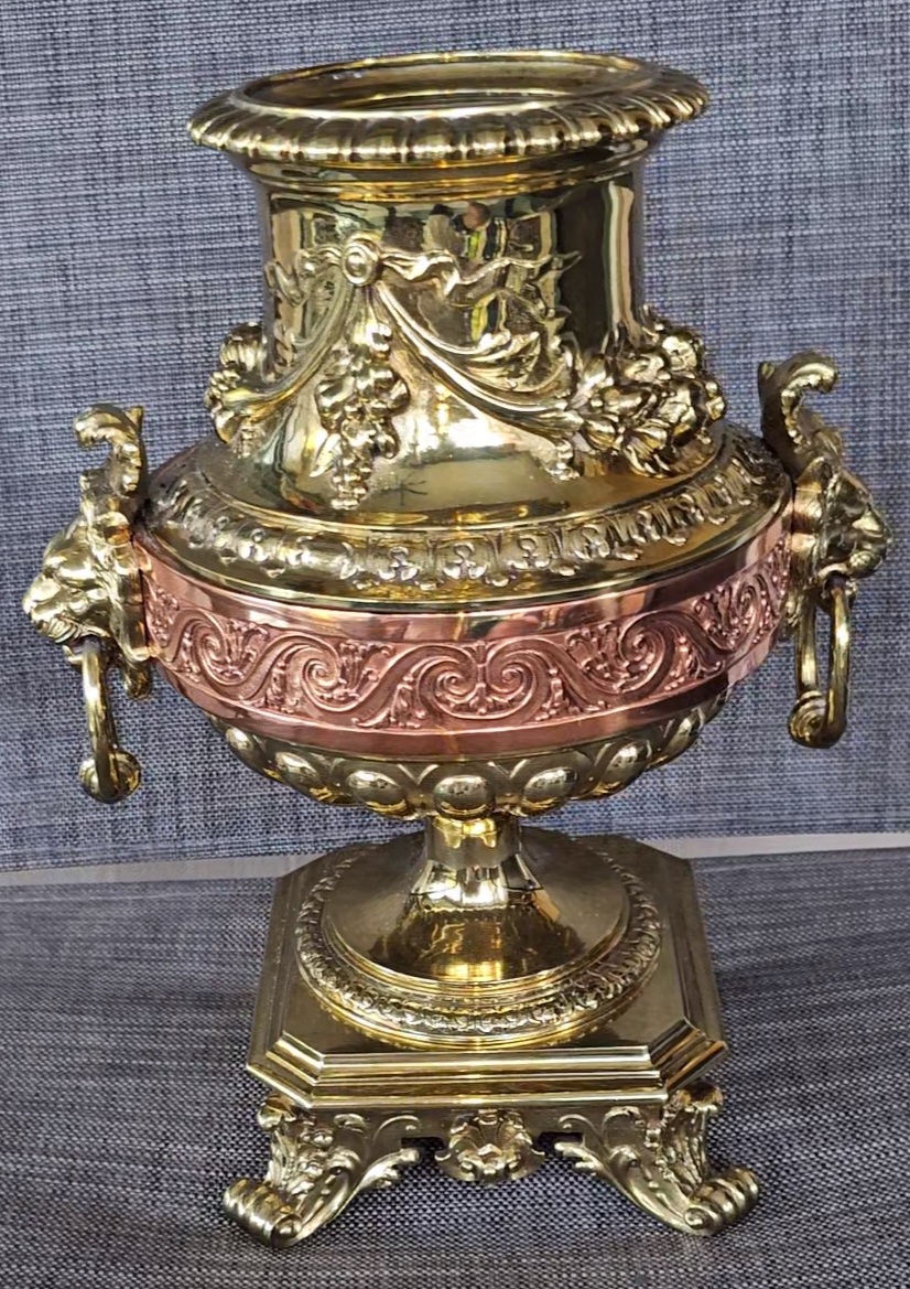Antique brass copper pedestal urn jardinere help