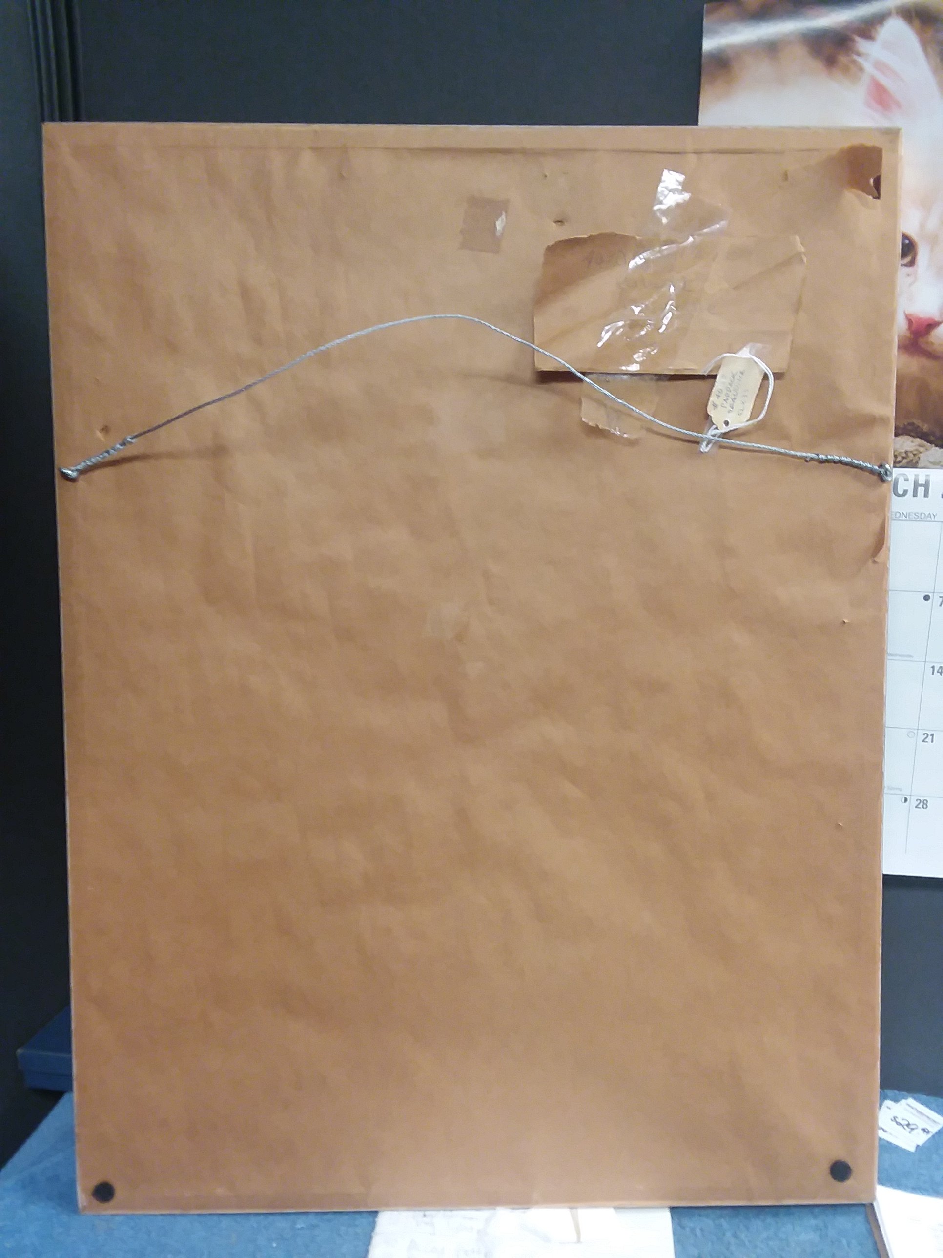 Is that an envelope taped onto the back? If so, the cellophane tape looks pretty dried out and brittle, maybe it could be gently removed and a clue found inside the envelope.