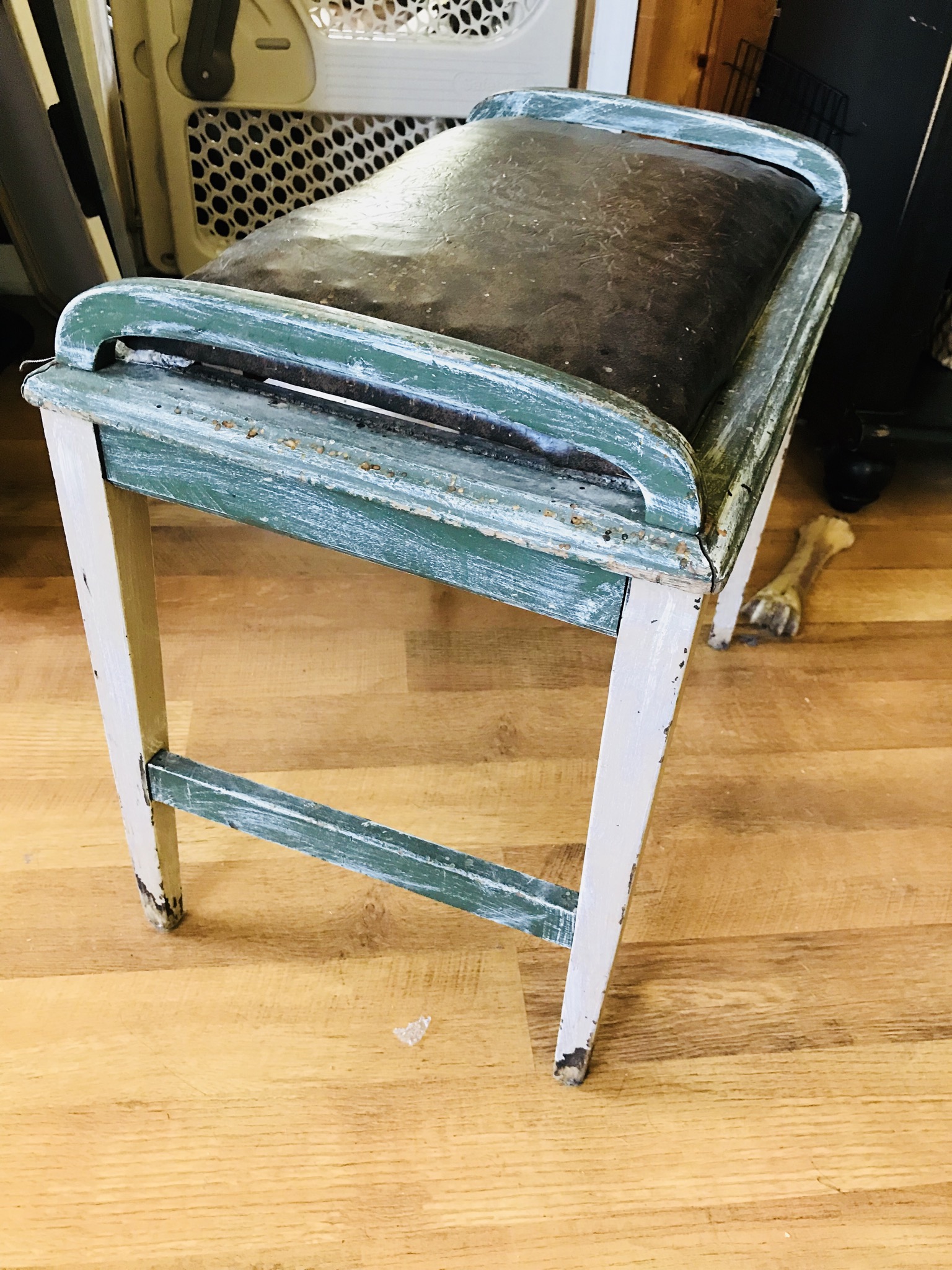 Yeah, it’s a little whobbly, the handles are attached at the top, it looks like maybe someone has put a different fabric over top of the cushion and it’s missing some sort of bar that probably went across the bottom. Is it worth anything or should I just go ahead and restore it to my liking?