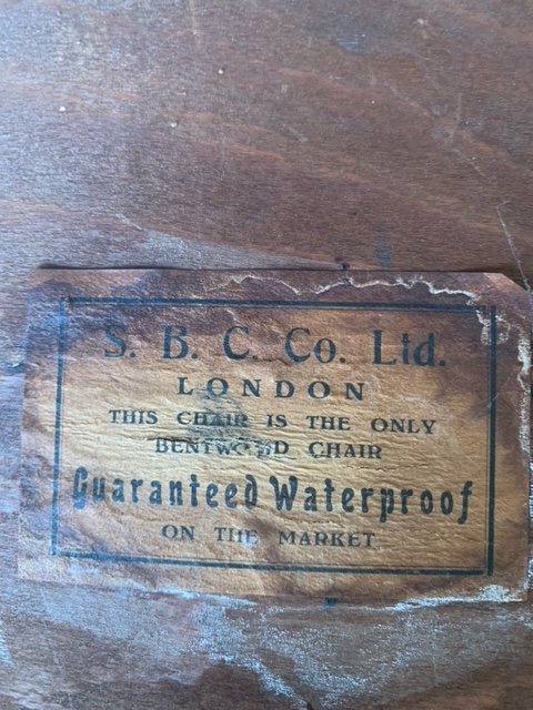 Could any of the furniture buffs here help me identify this chair which belonged to my mum. I’m guessing it’s late victorian or early 20th century. The manufacturer is SBC Co Ltd who I think were in London and claimed to make the only waterproof bent back chair at the time. See picture. Any info gratefully received.