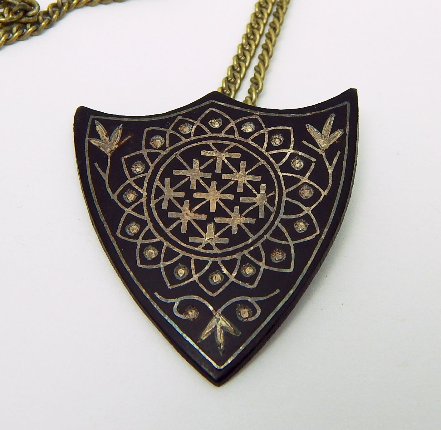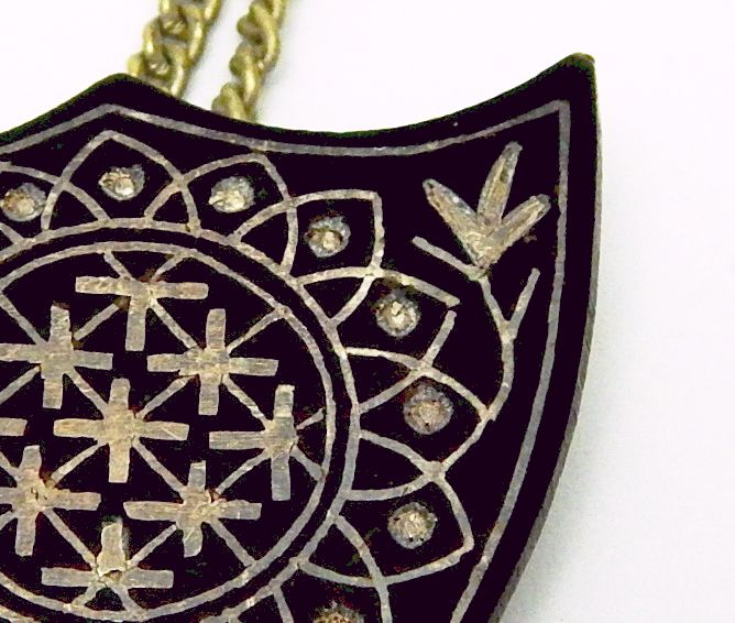 Black metal pendant with silver inlay