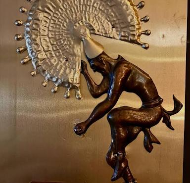 The piece shown is a wall-mounted sculpture depicting a stylized figure with an elaborate, fan-like headdress that resembles a celestial body or a ritualistic dancer. Bustamante's signature style is characterized by the smooth, polished bronze of the human figure contrasted with the textured, silver-toned metal of the decorative elements.