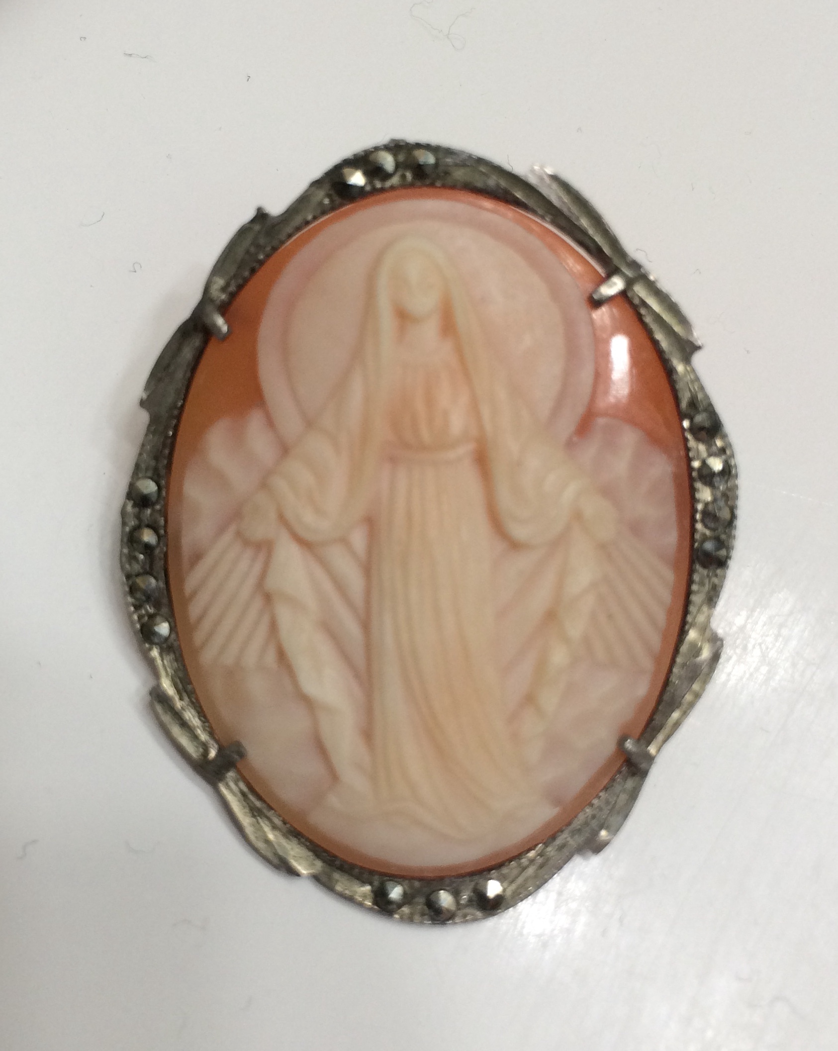 This is another one from my grandmother’s eclectic charity shop collection. The frame is silver with marcasites. I assume she is the Virgin Mary and she seems nicely carved. Any ideas how old it may be?