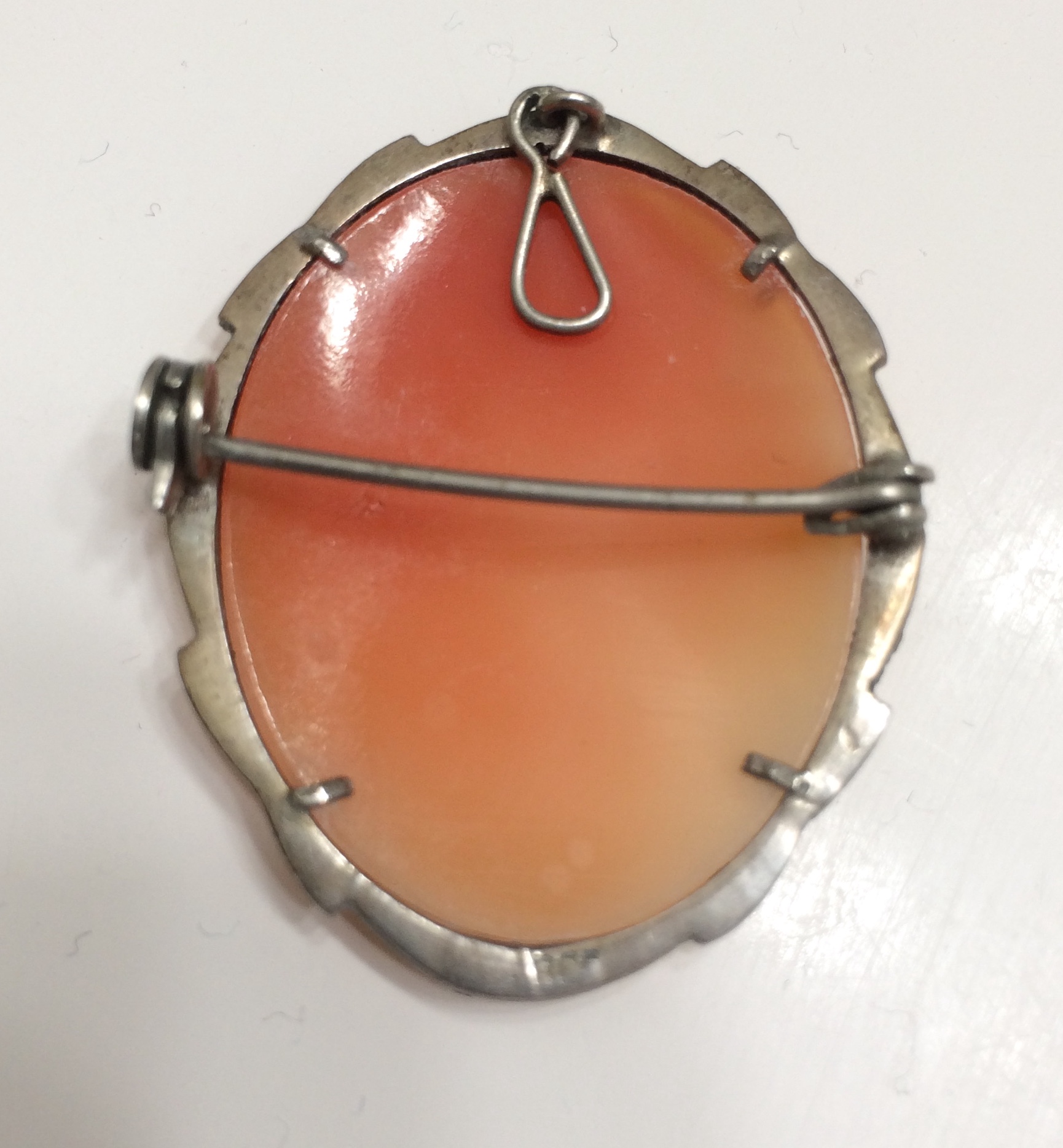 Thanks, fig, for bringing that pic forward. It was the first thing I was going to check. Even if it is a hairline, it is not fresh. If it were, it would look whiter, not browner. Suspect what was felt was exactly what was first thought, a slight shift in the setting. (As a side note on that, as long as the cameo is in no danger of falling out, I think a bezel setting that is ever so slightly loose is preferable to one that is snug. The combination of drying with age & relentless bezel pressure is what I believe causes shell cameos to develop multiple parallel hairlines the way some of them do.)