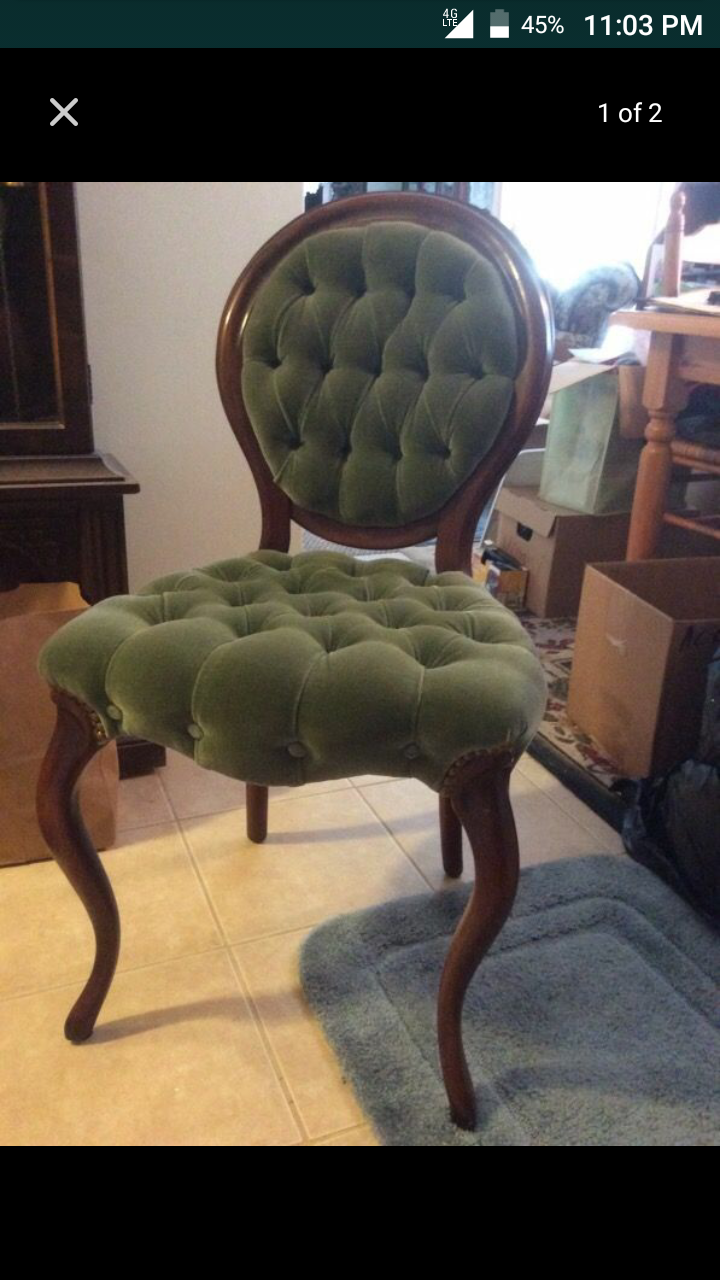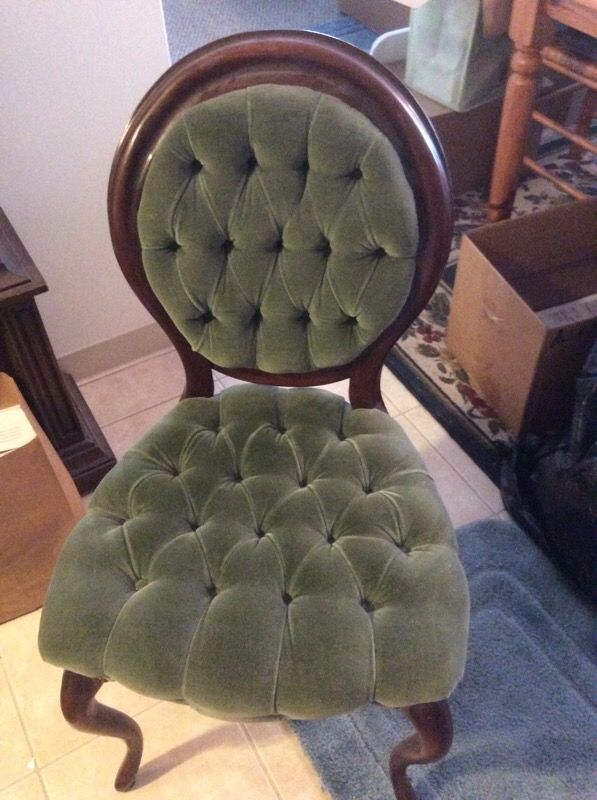 Perhaps a replica? Maybe "Modern Parlor" replica: Edwardian (Oval back, button-tuffed, velvet fabric) armless (womens; maybe boudoir)? Wood raises concerns about it being a true period piece. Cabriole legs (even if only a replica) are present but the backing and chair in general seems to lack the ornamentation of common Victorian furniture.