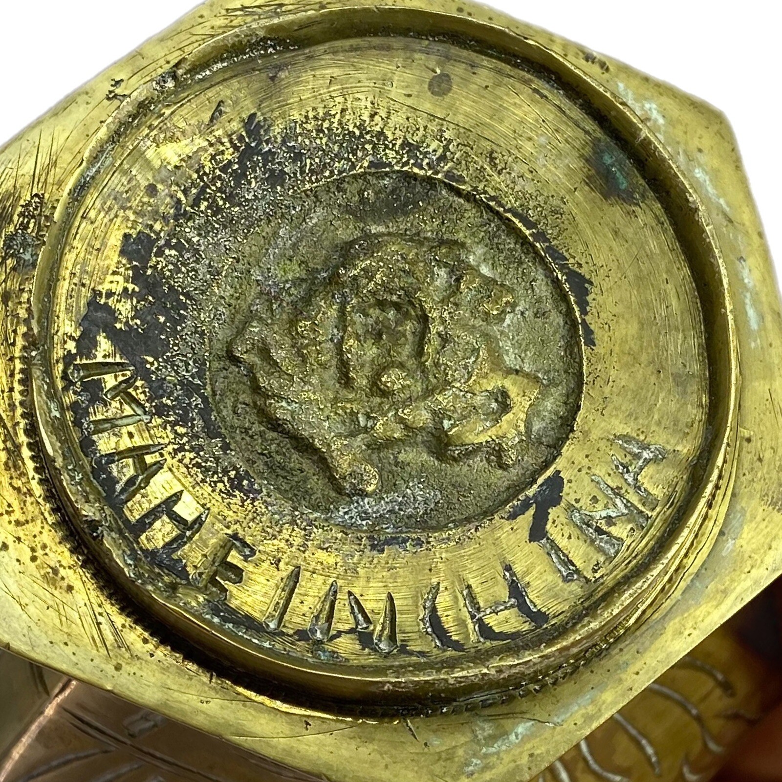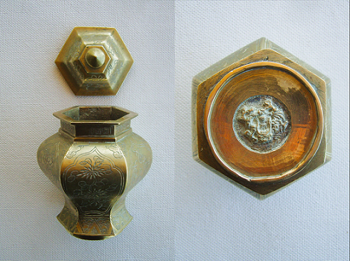 Chinese brass lidded jar. Mysterious relief on the bottom ...