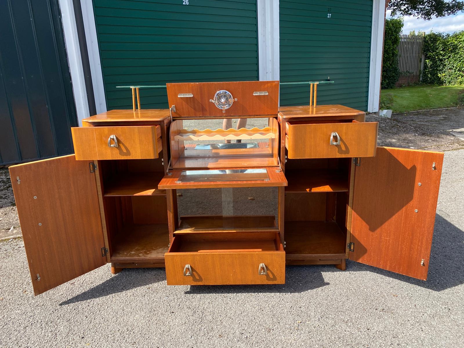 I bought this cocktail cabinet in the UK recently, not because I thought it was worth a lot of money but because I liked it. The mirrored, hinged pull down mixing shelf is very cool!