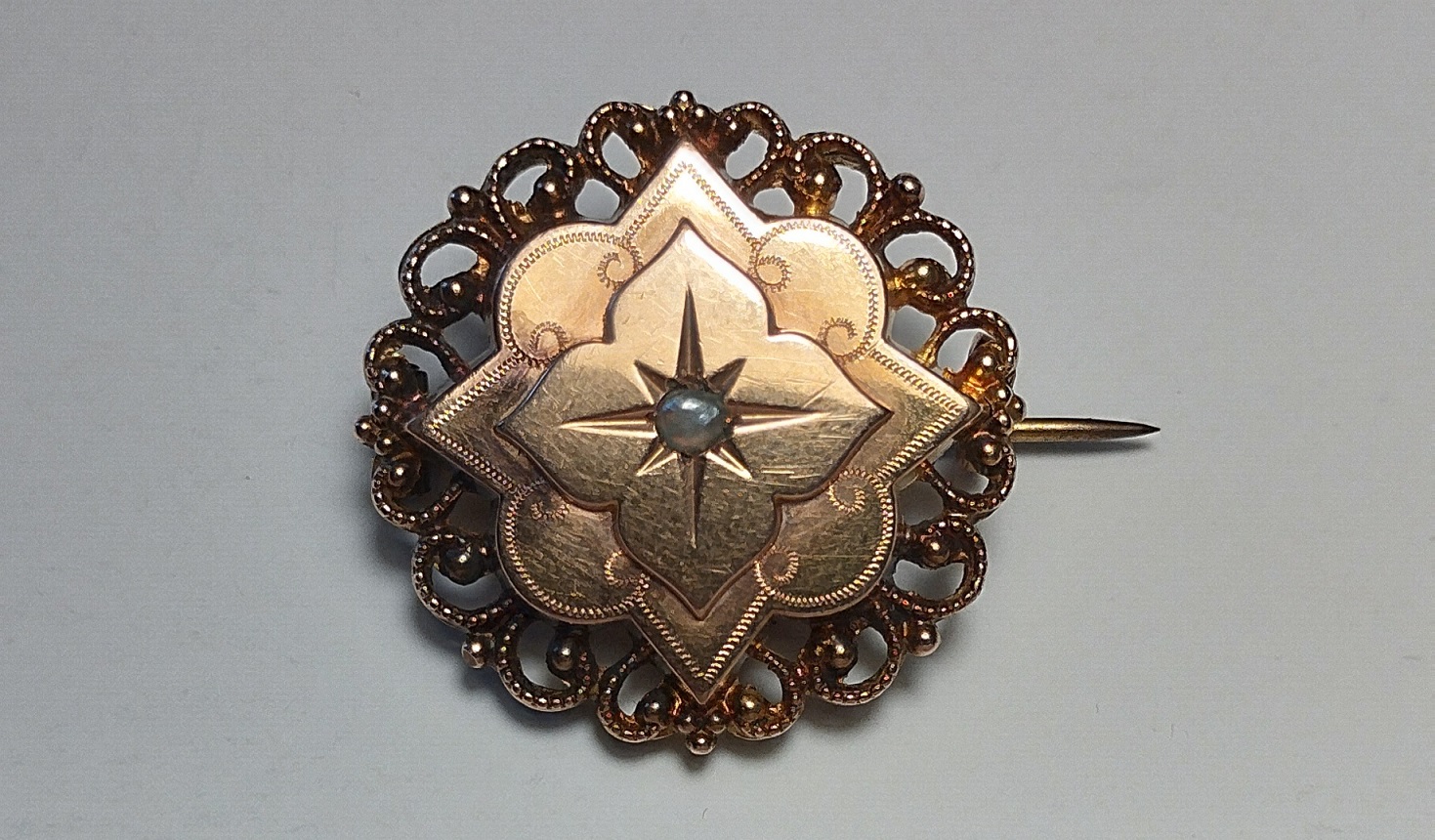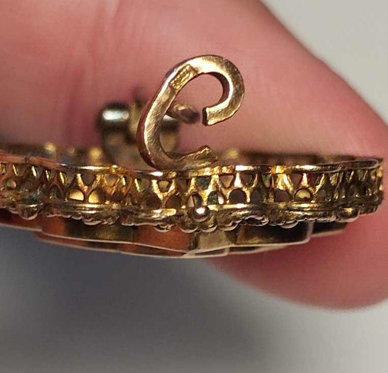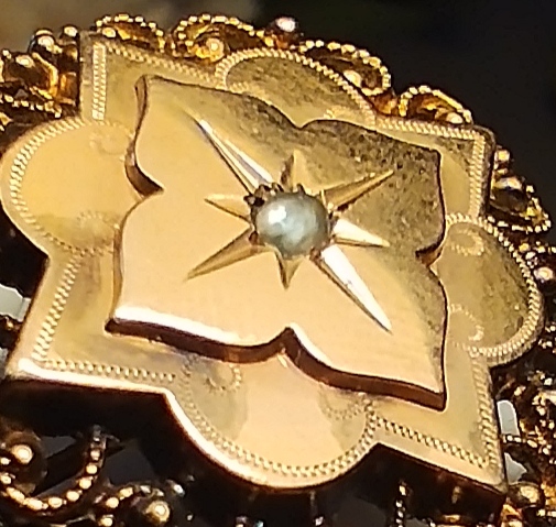 Well I'm quite tired now after galavanting around the forums this evening, but its been a very good thrifting day! I have MANY questions about this little brooch. It so badly wants to be Napoleon III (1850-90), but perhaps my inexpert eyes are getting in my way. Here's my observations, correct away as you see fit! Very light, with stamped (?) metal, so mass produced? Seed pearl, but haphazardly mouted Hardware/pin length are right, and of good quality, but that clasp looks awfully shiny and new looking (not as visible on the pics, but there's a clear difference between it and the pin and hinge) The clasp is stamped with a makers mark by the looks of things, but the name plate on the back wasn't done in those days, isn't that a sign of a 20th century piece? I thought pre 1900 pieces would have stamps, not plates. Here's the kicker, there are many similar pieces with the FIX plate on the back, and all of the listings describe it as Nap III (hence my mention) and gold plated. What is to be learned here? TYIA!