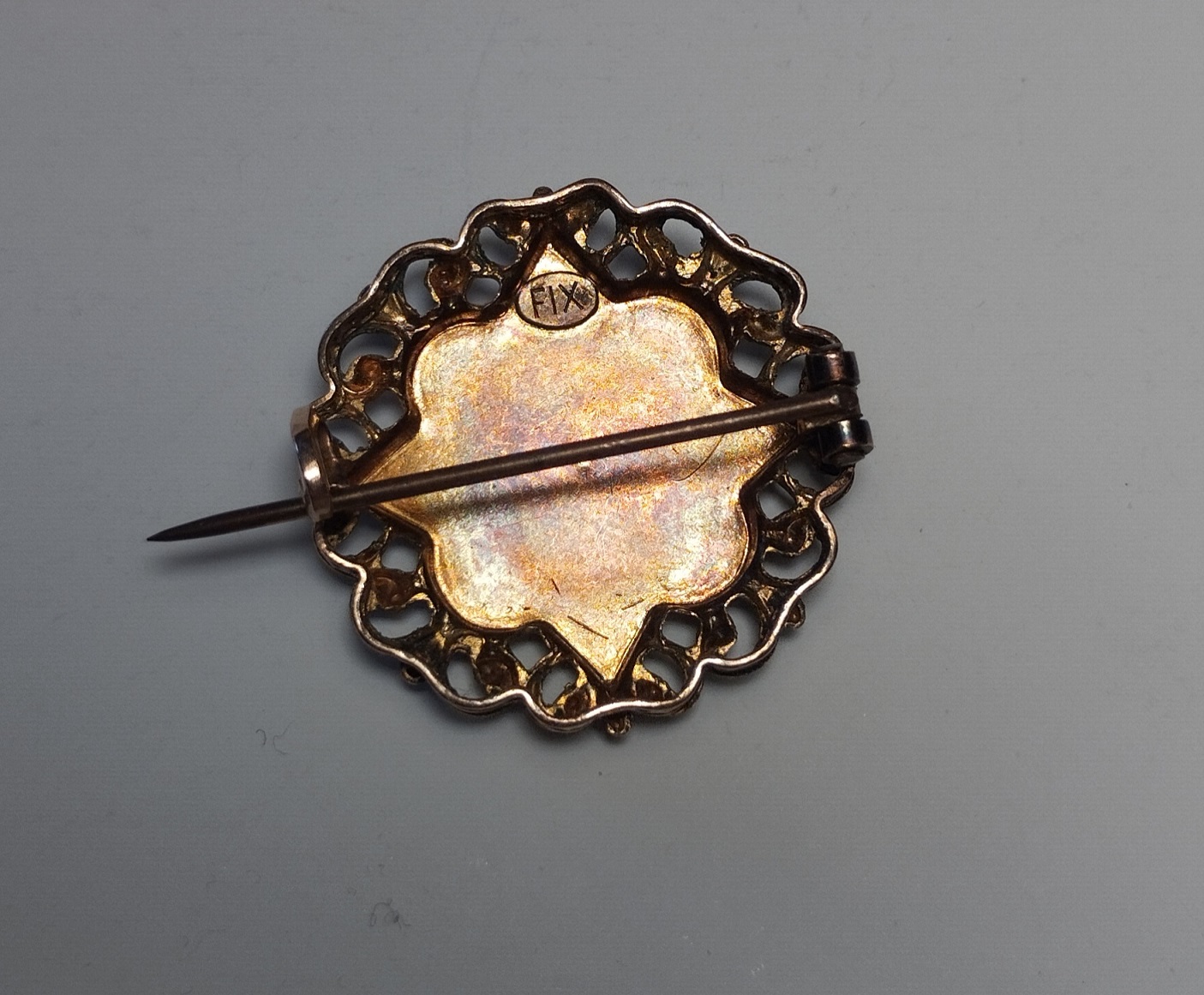 I've come across a few overhere as well, but know nothing about FIX. The back is very promising. It is a lovely brooch any way, nice find. Tagging @kyratango .