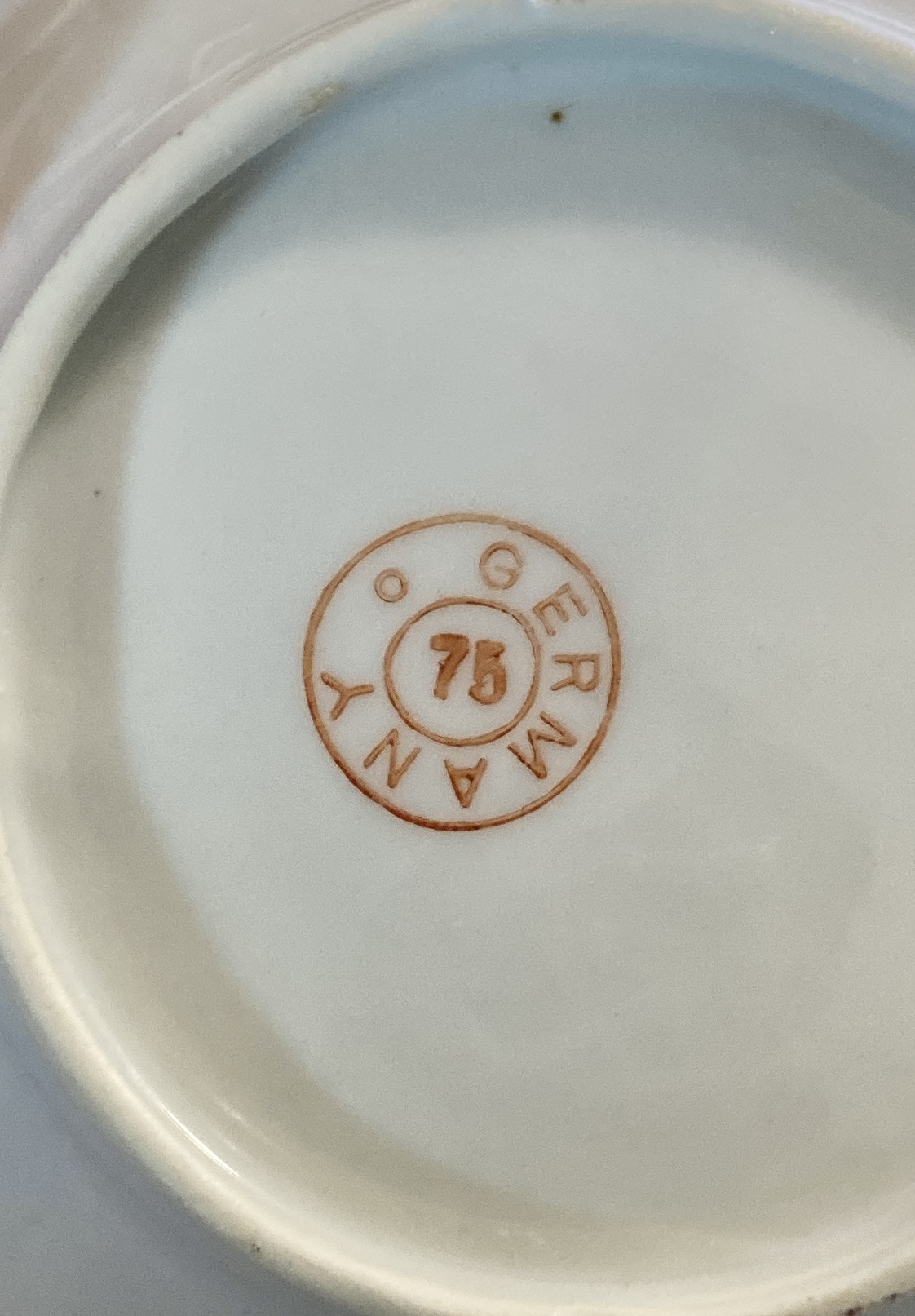The stamp is just a red circle with Germany inside it, followed by another circle inside that with the number 75. Other china does have similar marks with other numbers, but the sellers don't have any information to ground their dating.