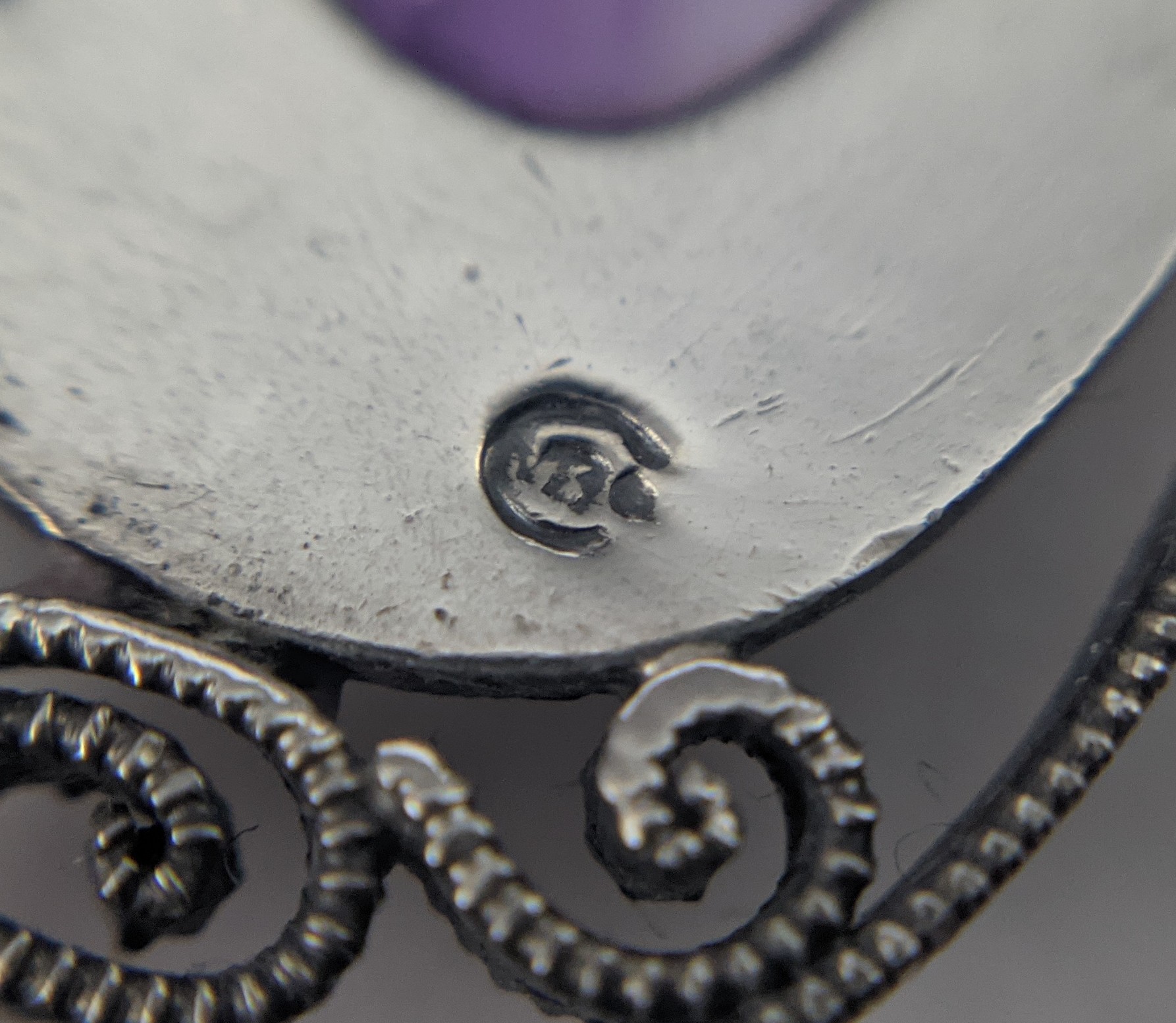 First is a Murrle Bennett silver & amethyst pendant, cost £33 on eBay, second is a pair of Irish Dresden figures for £7.50. Pink guilloche & sterling vanity set for £85, and a small Chinese vase for £2.