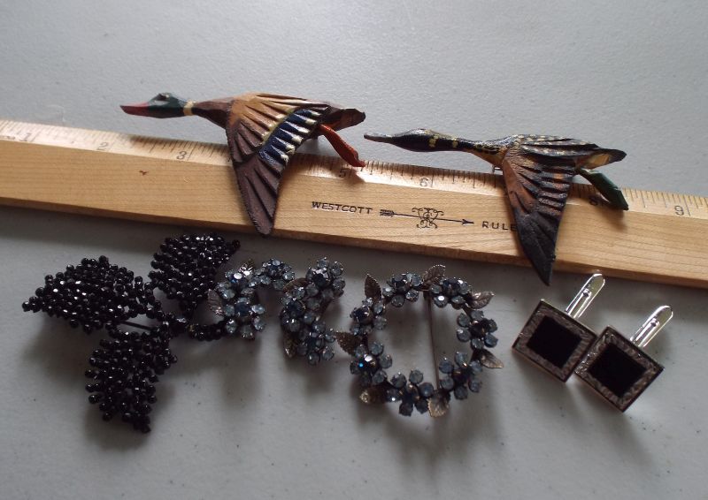I was in the second shift at an estate sale yesterday instead of second in the door. Still managed to get Stuff as most of the other folks were after kajillion tons of automotive and WWII-related paper. The house was loaded. Also loaded with stairs everywhere. Total house of horrors for anyone mobility-impaired. That said, I found some things anyway. Still need to clean them up and photograph, except for the ring that hopped on my finger and wouldn't leave. The other goodies are from an antique store today. I've started threads on the birds and the leaves. The blue rhinestones are 1950s Weiss and the cuff links are 800 silver.