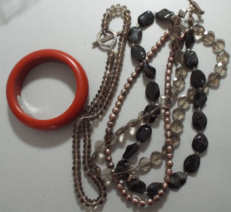 The single-strand necklace is smoky quartz, double-checked by my idiot diamond tester. Sterling clasp. The multi, which cost $2, is most likely glass but clasp tests like silver.