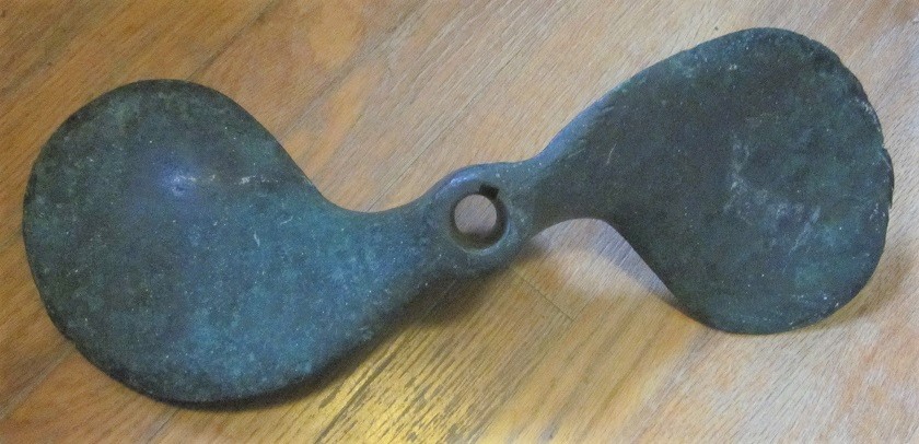 17" boat propeller. Likely bronze. Looks like it has had a bit of use. $6.00 at the thrift.