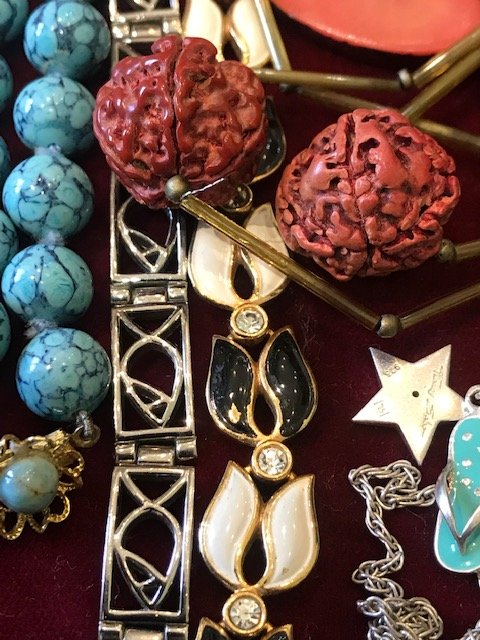 Today's finds. Brooch is hallmarked for 1891 Birmingham. Coral necklace needs to be restrung (it was a bag of loose beads that I then strung on some thread to keep track of and added the clasp), but it was only 3 euros (any idea what kind of coral it is? Or how old it might be?). I got the blue beaded necklace for free, thought it was just junk, but after some Googling, I think it's Persian blue faience donkey beads. The blue spacer beads look old too. thumbnail (6).jpg thumbnail (4).jpg