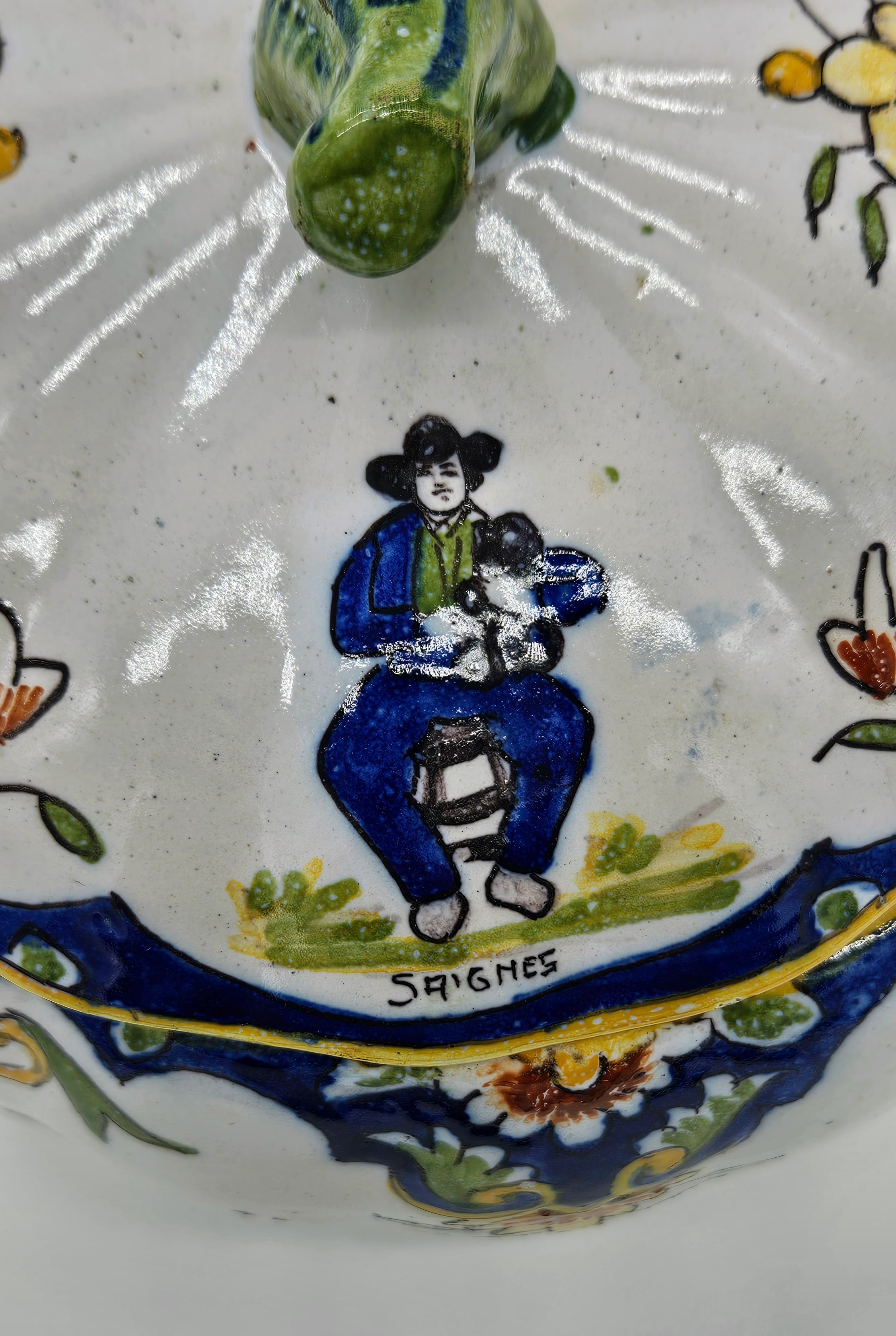 I found this piece and it appears old but they maybe fooling me. The little guy reminds me of Qimper. It says SAIGNES under his feet. Looks to be a small town in France but I could find no record of a pottery there. Maybe made for tourists? The mark on the bottom is obscured as shown. Can anyone shed some light on this for me?