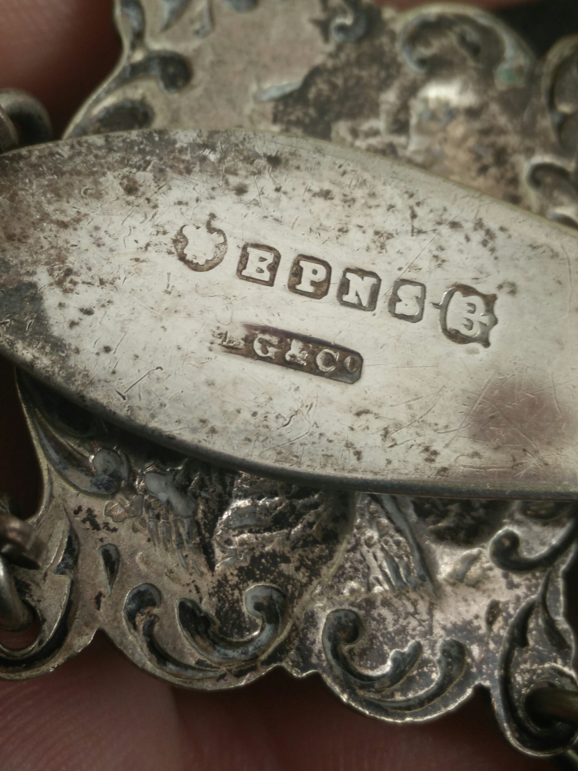 Hmmm... I used the pic the OP posted in message #15 in my #33 reply. Has there been one posted since then? I haven't kept up with the forums as of late because am at the moment scaring dolphins in the southern reaches of the sunshine state. A couple of days ago I did try again to ID this maker's mark from the limited online sources. The closest I could come up with was that of "Britton, Gould and Co." of Birmingham. One of the maker's mark they used on sterling was "B, G & Co" in the same shape cartouche. I couldn't find a definite silverplate mark by them. They were in operation at the time this chatalaine was made. I have seen several BG & Co. in a clover shape cartouche that have been erroneously attributed to Britton that were really the mark of Boardman, Glossop & Co.