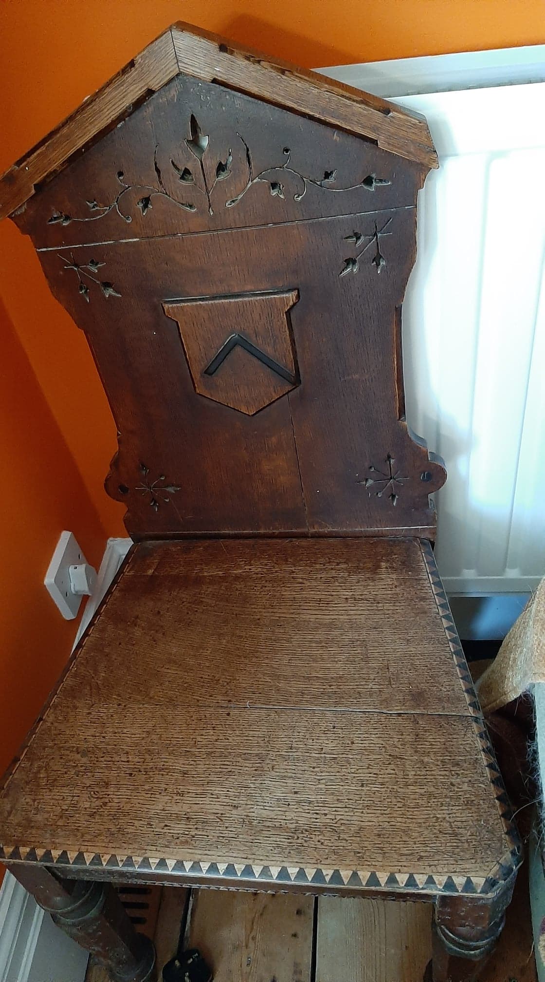Interesting symbol on chair back, a carpenter's square perhaps? Could be a chair that was part of a lodge or society.