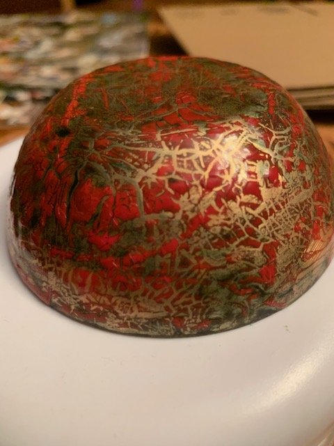 Yes, that's just the light shining on the piece. The inside colors are mainly turquoise and the outside is a burnt red. As for the outside picture, I couldn't make sense either, in some areas I'd think I saw a dragon beginning to form. Then I stopped trying, I didn't want to force something that wasn't there. Should I send another picture?