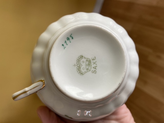 I have this teacup I believe to be from German manufacturer Ahrenfeldt. Mark does not indicate country, so I think it was made before 1891 (McKinley Tariff Act) but after 1862. I base this all on general research, but I can’t find much online to support this exact cup, so I could be dead wrong.