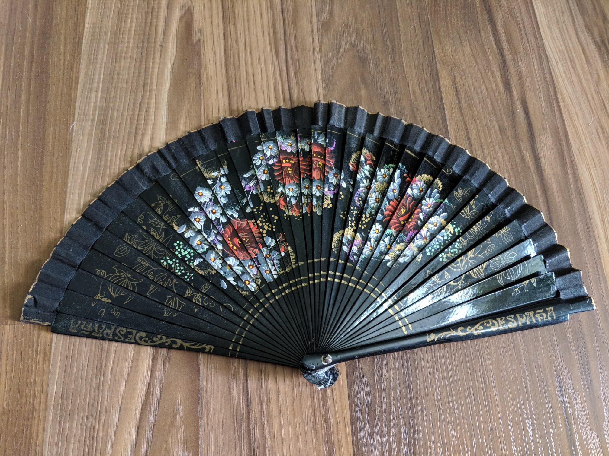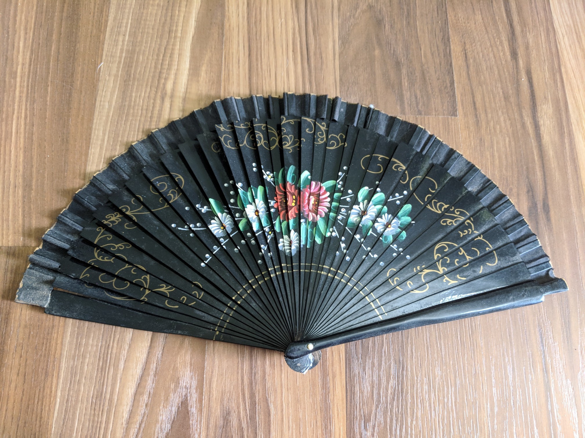 This is a fan I have for sale displayed with some perfume bottles, it has celluloid ribs and the birds are painted :)