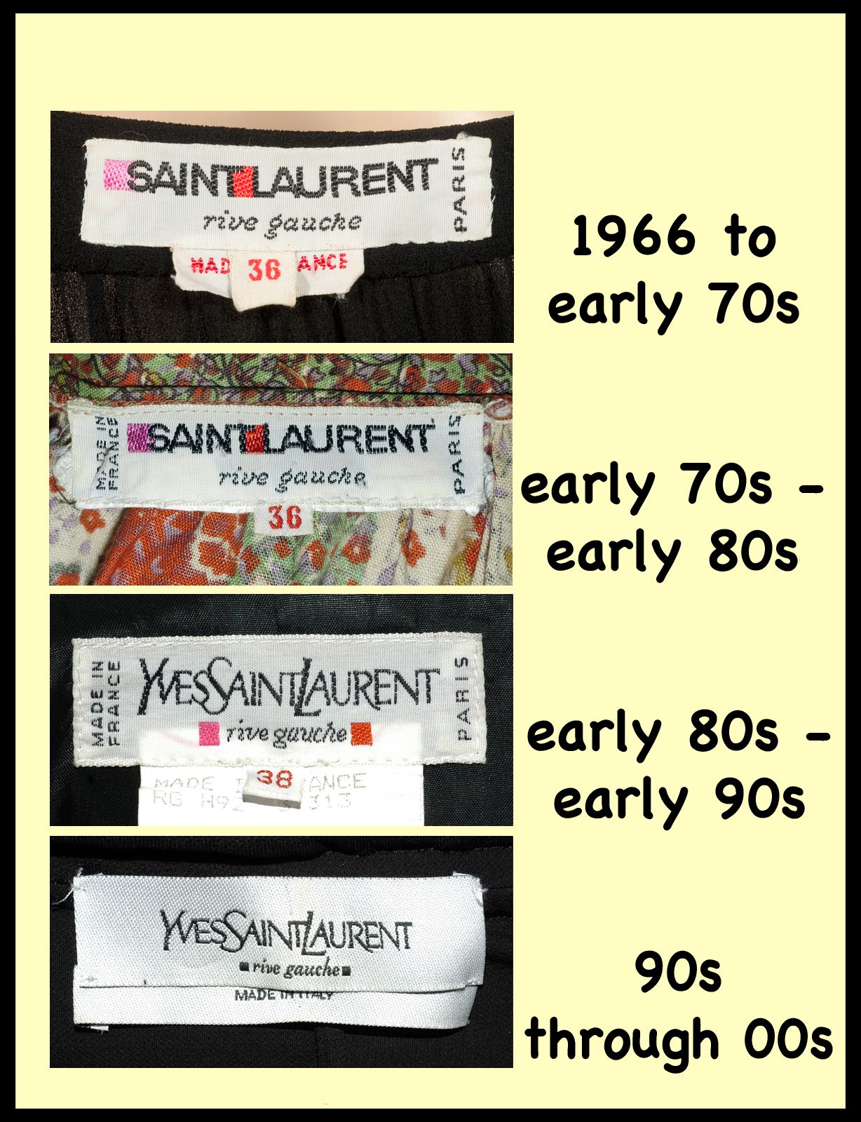 You’re comparing apples and oranges with those labels. The OP’s jacket is a licensed (definitely as frighteningly 80s as could possibly exist) piece as already identified. The Rive Gauche label is Saint Laurent’s vintage made in France boutique label. I worked at Rive Gauche in the 70s. Still have a few prized pieces.