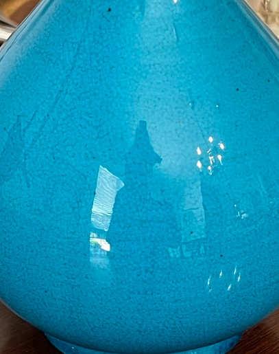 I'd welcome thoughts on this unmarked long necked blue vase. 9 3/4" tall. It's lightweight, recessed unmarked bottom, and a nice looking shade of blue. No marks.