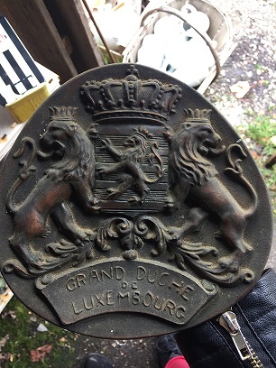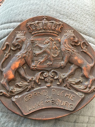 Does the back of yours look like this? https://www.vinterior.co/home-decor...uchy-of-luxembourg-shield-plaque-coat-of-arms Things on Ruby Lane, where asking price is $295, tend to have very inflated prices. The one above is described as antique & that is figuring into their 119GBP asking price. Since there are so many of them floating around, would have to figure mass produced decorative items from mid 20th or later. Another one, said to be pewter &, fortunately for them, just qualifying as an antique: This item is antique. 'The date of manufacture has been declared as 1920.' None I have seen so far look like pewter to me. Bronze is my best guess. Aha! https://www.worthpoint.com/worthopedia/vintage-metal-grand-duche-de-1784980029 Everyone who has one wants to think they are rare & antique & it seems like everyone & his brother has one. Can't really imagine anyone but a Luxemburger wanting one of these; can't imagine them wanting it enough to pay $300.
