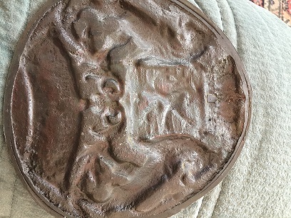 Yup @Bronwen the back of mine mainly looks like that, but without the ring indentation. Thank you for all that information! It could very well be bronze. Mine does not have that inscription on the back, would that suggest it is in fact a reproduction?