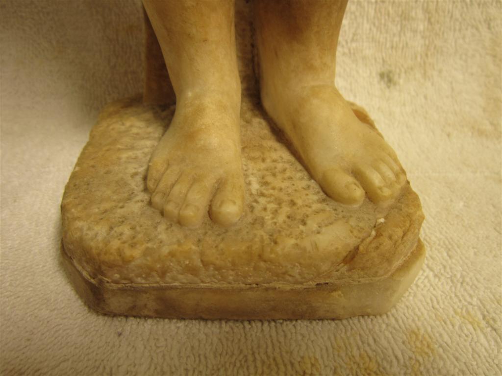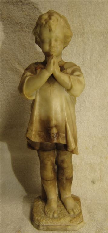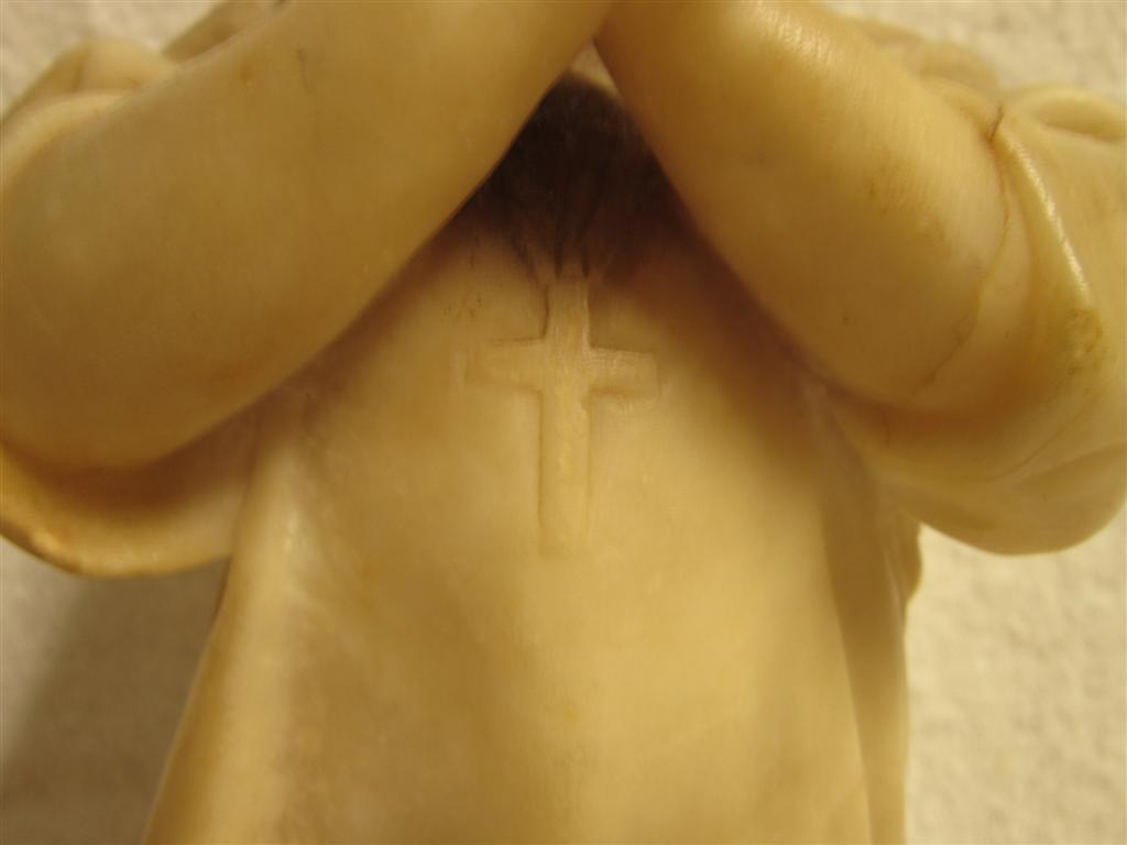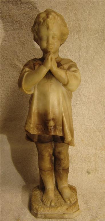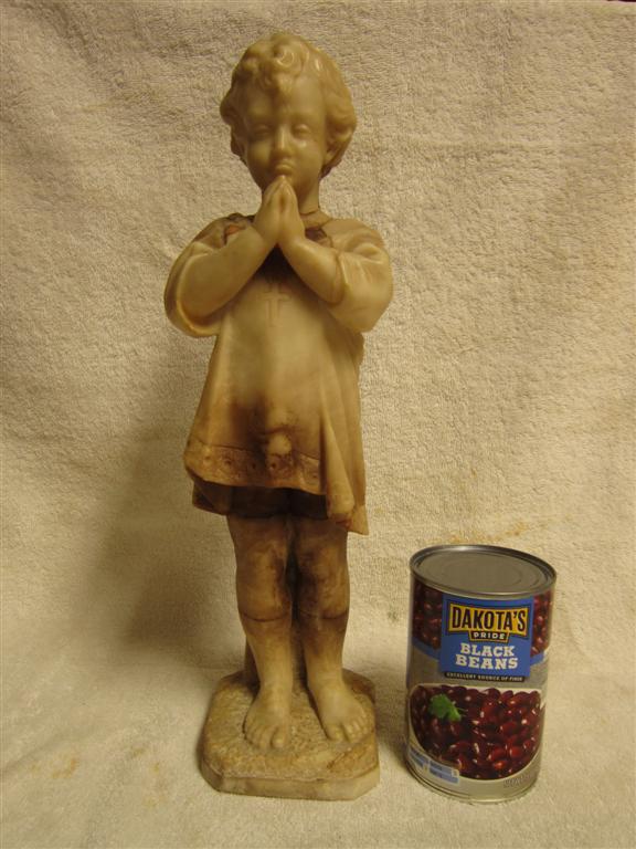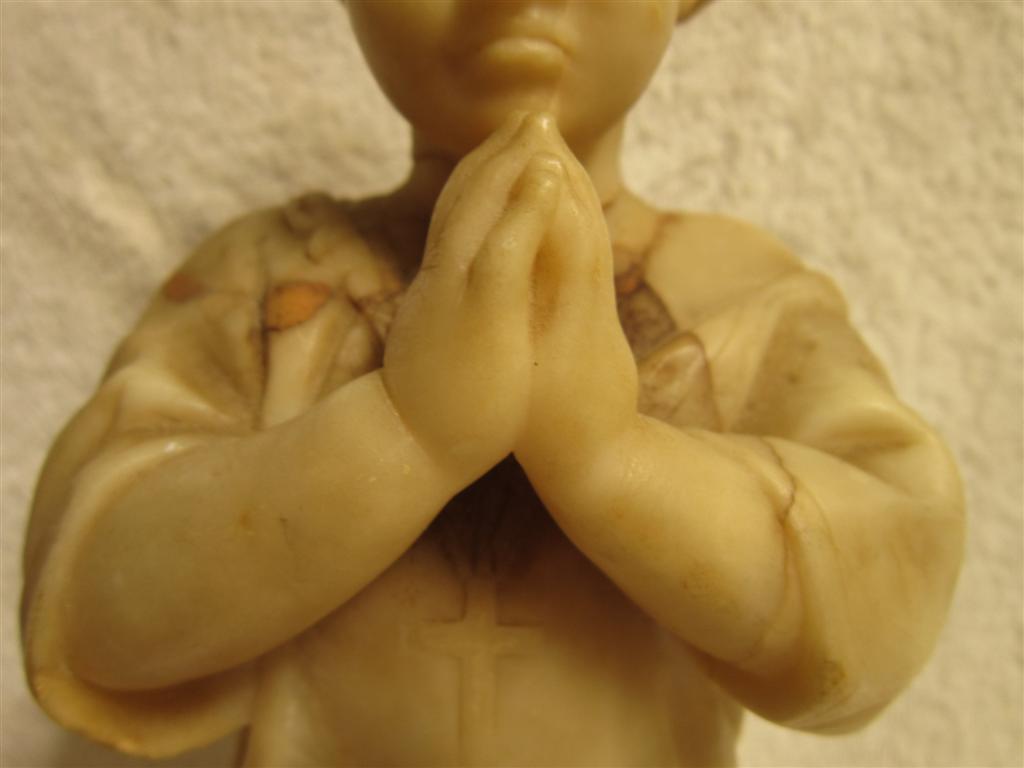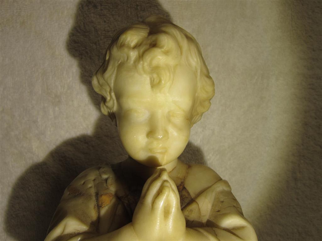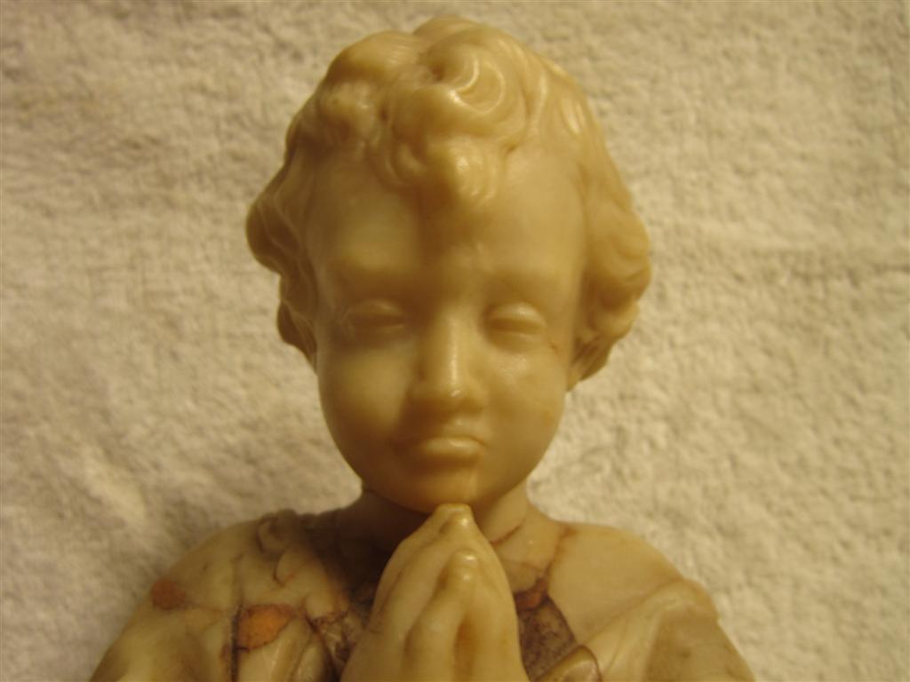 I recently purchased this choirboy(?) statue/sculpture at a thrift store. The sculptor/artist and its history are unknown. There is no signature or marking anywhere on it that I could find. The bottom of the base is smooth with no markings. It stands about 15.5 inches tall. The base is 3.75 inches by 3.75 inches. It is very heavy. See photo with can of beans for reference. What is this made of? Is it made of alabaster? Marble? (It is definitely not resin.) It appears to be carved from pieced-together or joined-together sections of stone. How the pieces were joined, I don't know. The areas of transition from one section (color) to another are perfectly smooth. The only place that is rough (less than perfectly smooth) is at the back neck where perhaps the head did break off and was rejoined (glued?) at one time. There is some daylight in the cracks on either side of the neck. Since the neck transitions from dark stone to light stone right at the seam, I can't tell for sure if it was ever broken, or if this is where the pieces of material were joined in the first place. I handle this so very, very carefully because I am afraid that all of the "seamed" areas could be fragile. I feel so lucky to have found this piece and think it’s is gorgeous. I’m hoping it is really “something”, but even if it isn’t anything (valuable), it is to me because I love it. Does anyone recognize this work or this type of work? Can anyone help me get better identification? Is there a forum or site where I could post photos and get more information? I would be so grateful. More photos to be uploaded to the following post. Thanks, Susie