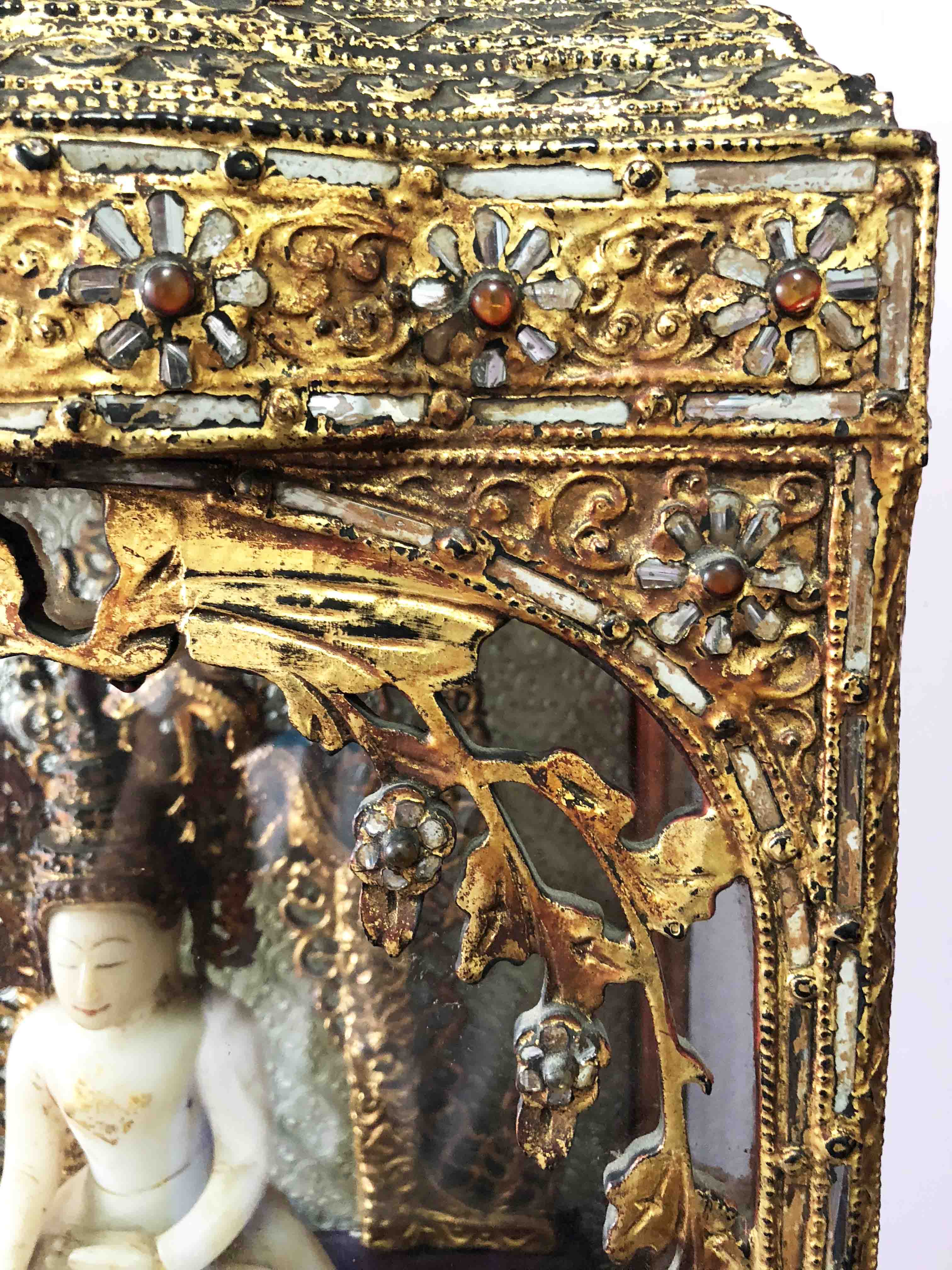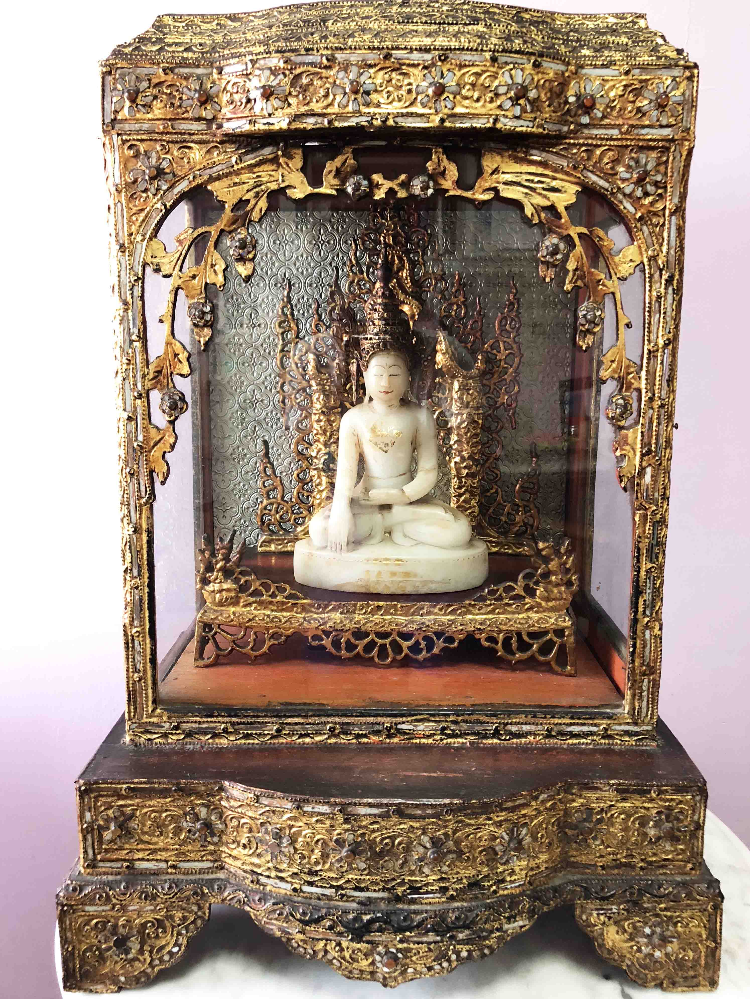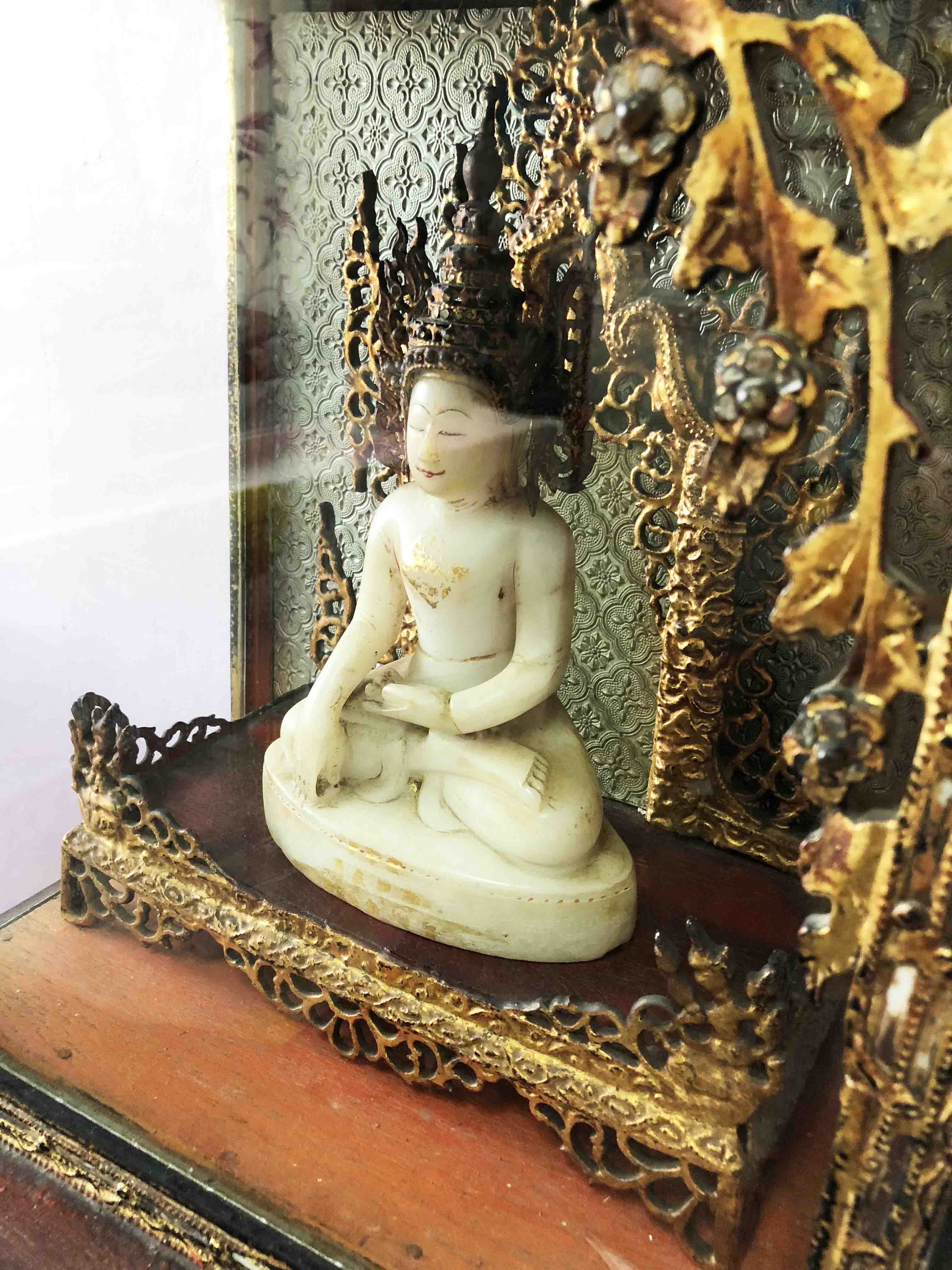 Featured Marble Buddha in Wooden Gilt Buddhist Home Temple(Late 19th C) - Burma