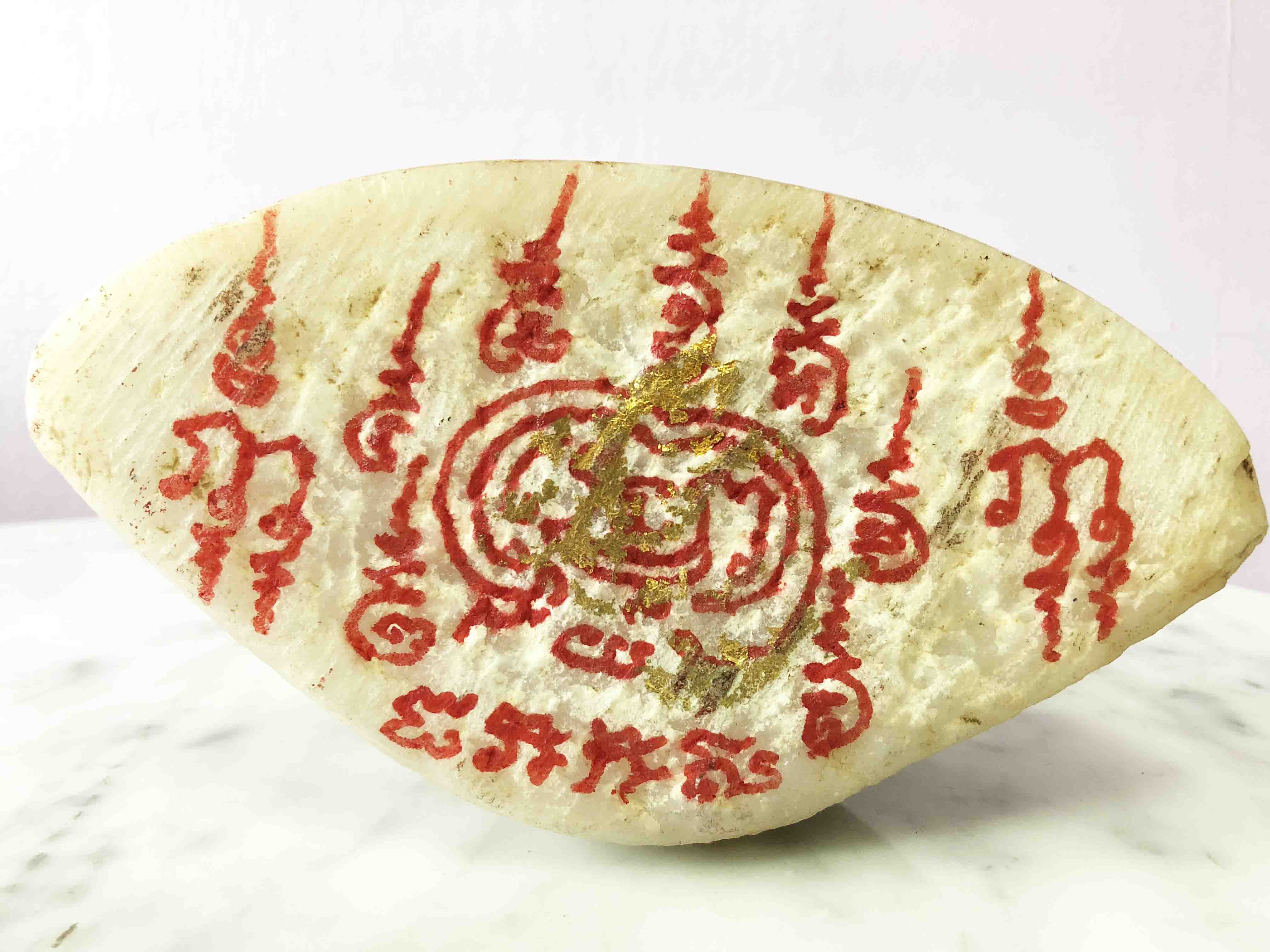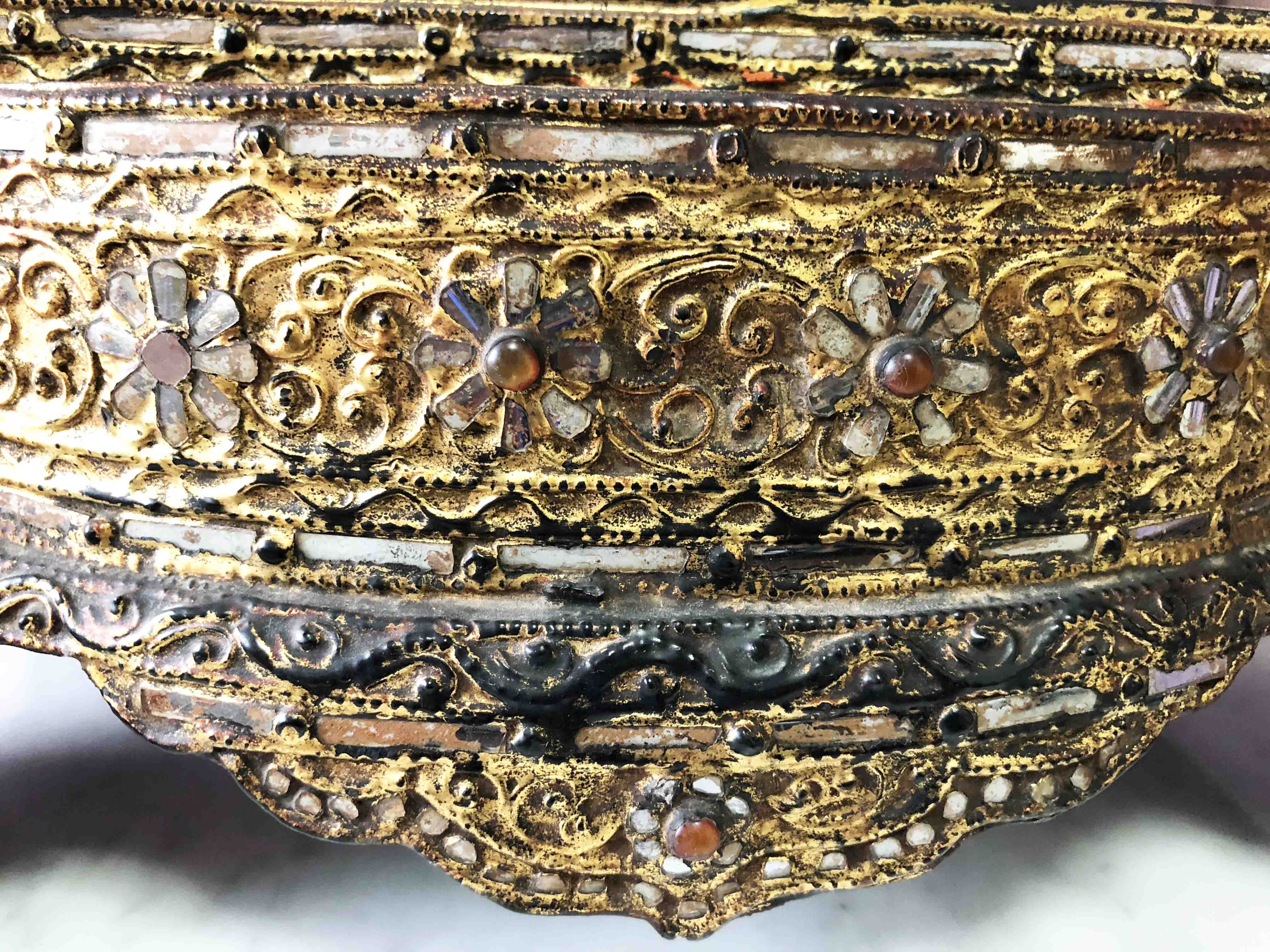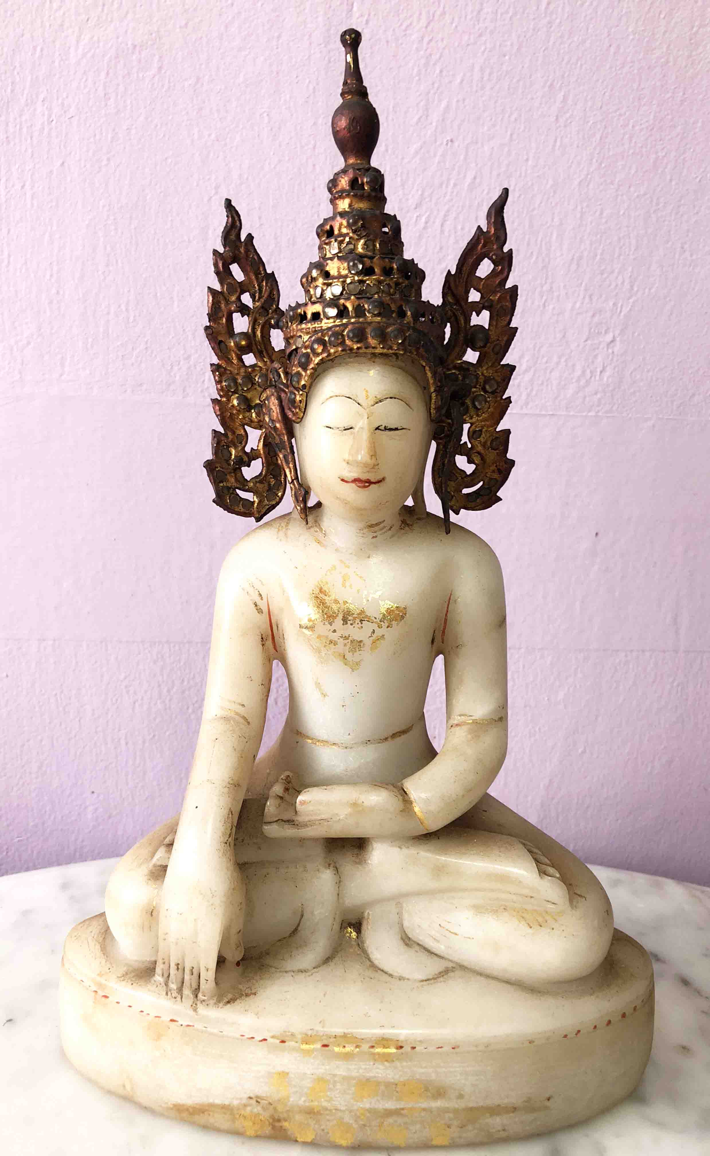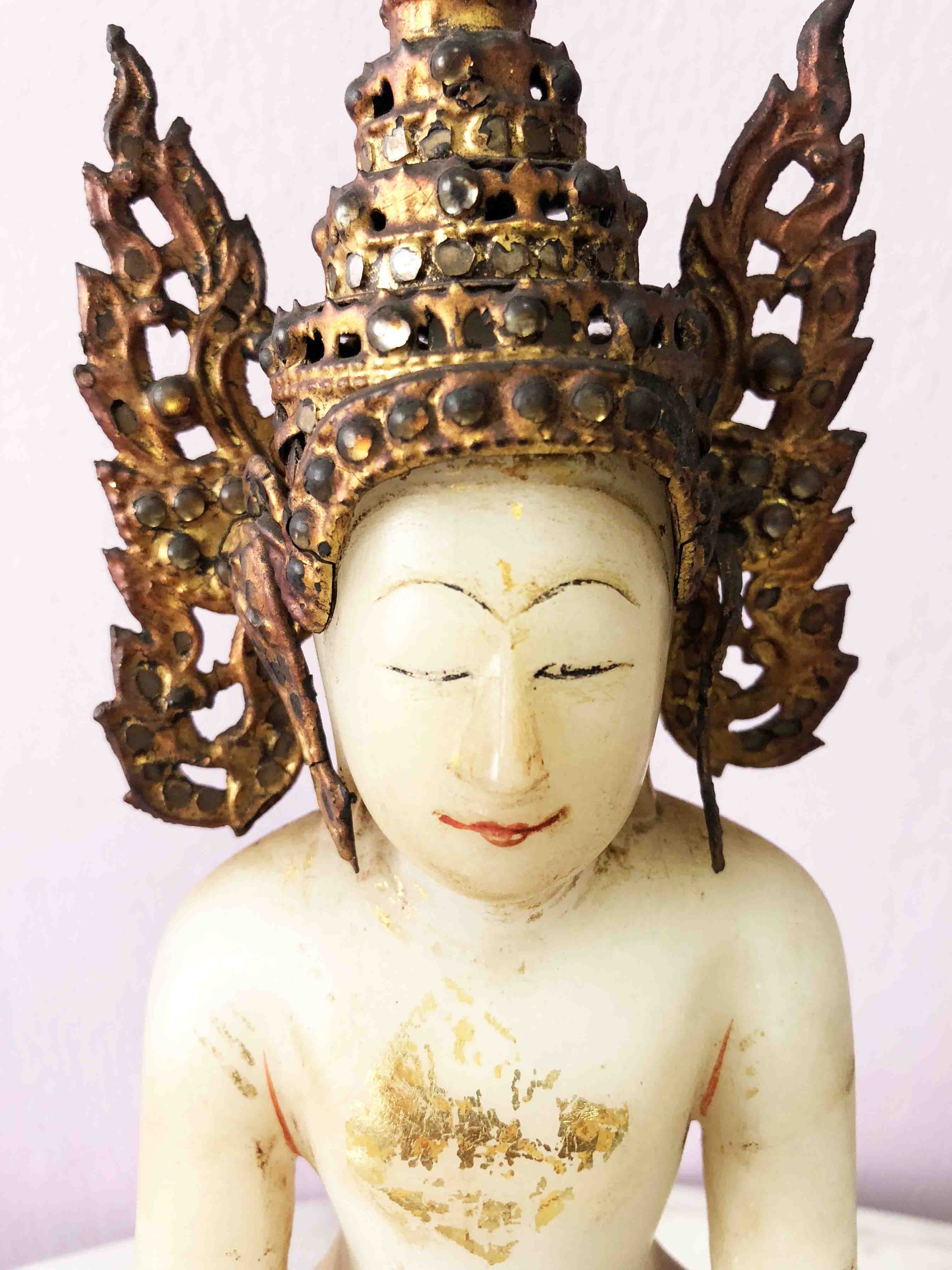 The gold traces on the front of the base are in a 5 then 4 then 3 pyramid shape representing a stupa or temple spire, also very common in Thailand and Burma. Enlarging that area of the image I just do not see further traces of gilt. I have perhaps a dozen gilt, carved, alabaster, timber type images in my collection and have been visiting this area of Asia for more then 20 years. I would love to add this one to my collection, it’s so amazing. :) I’m also very happy to learn more about this image and others that come along, and the gilt process. Thanks all.