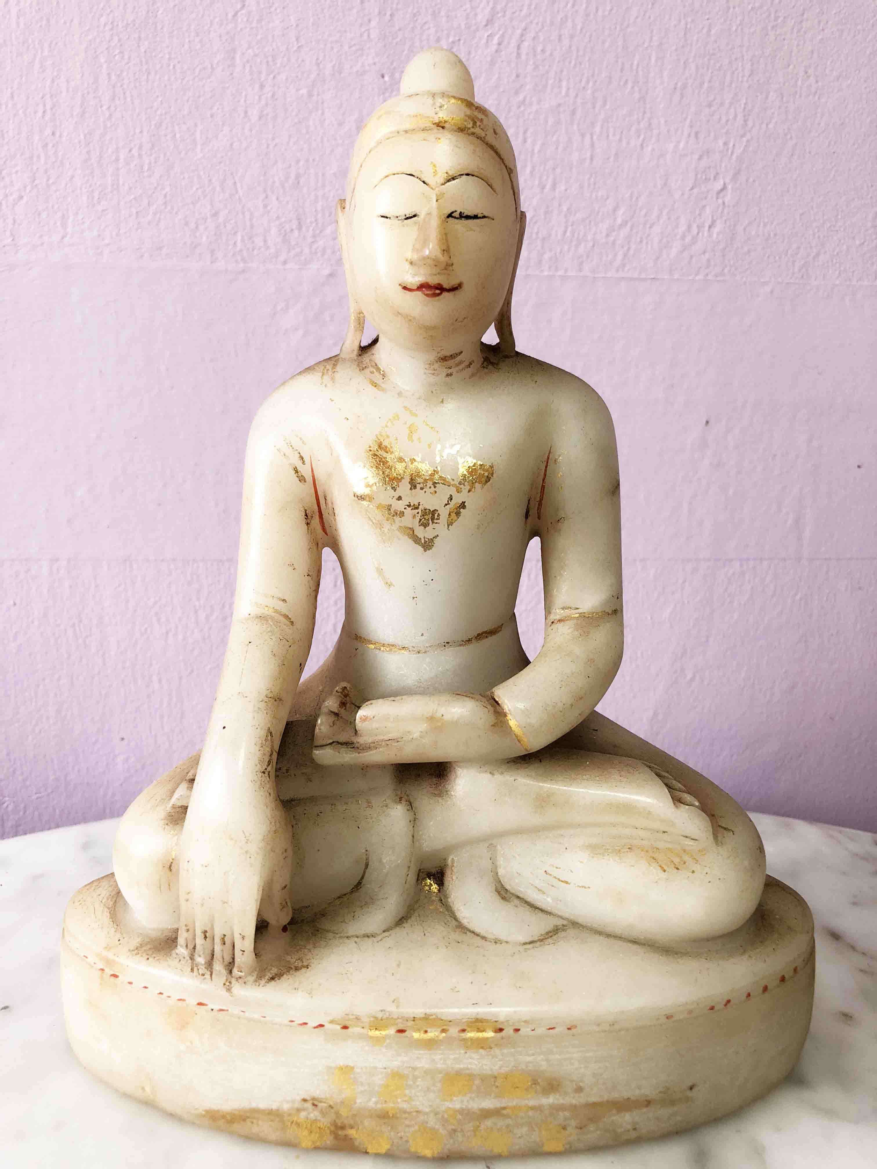 I agree with @AuDragon on the gilding. This was never covered in gold, only details, and the dots he mentioned. These alabaster Buddhas rarely had more gold.