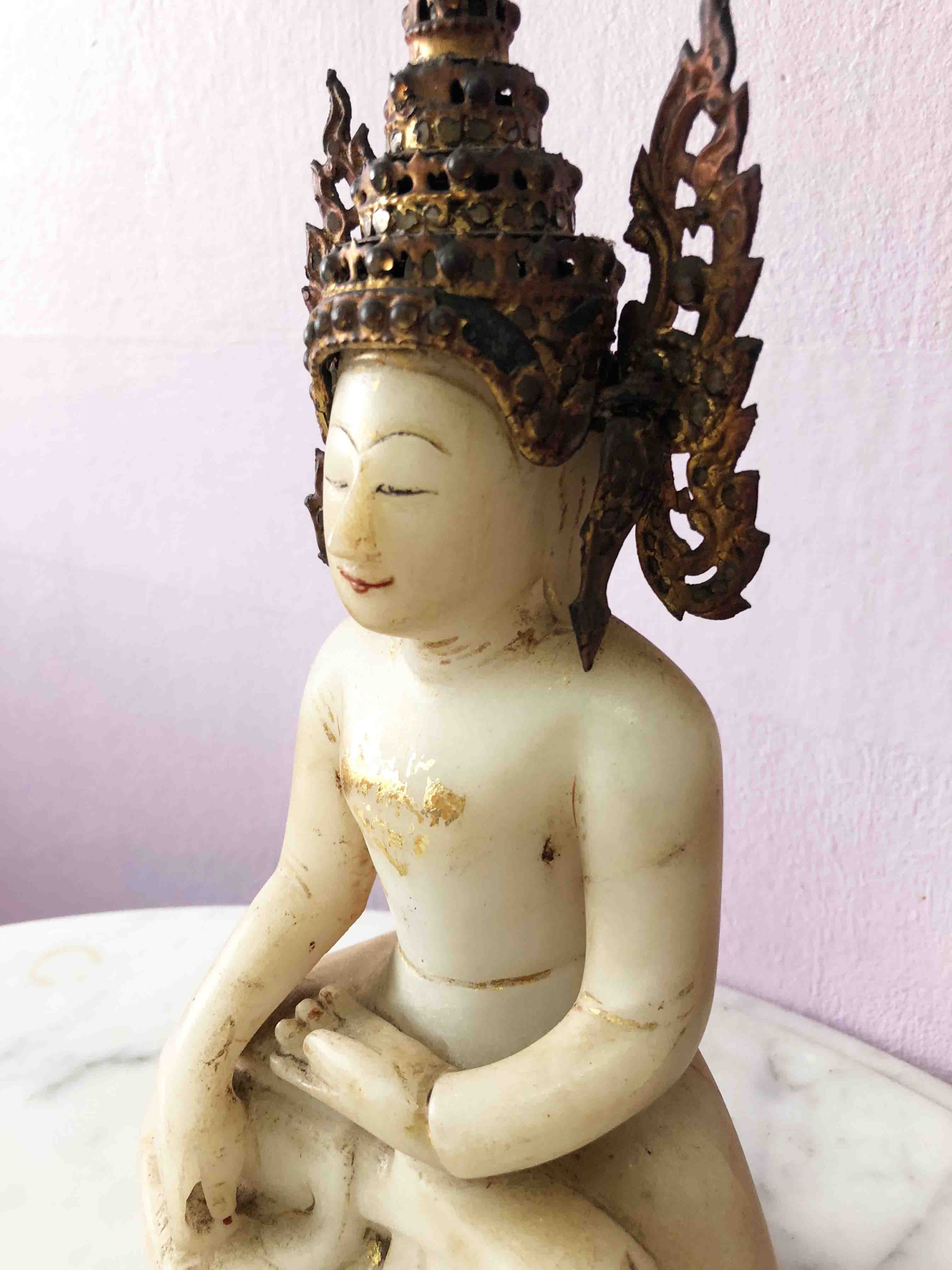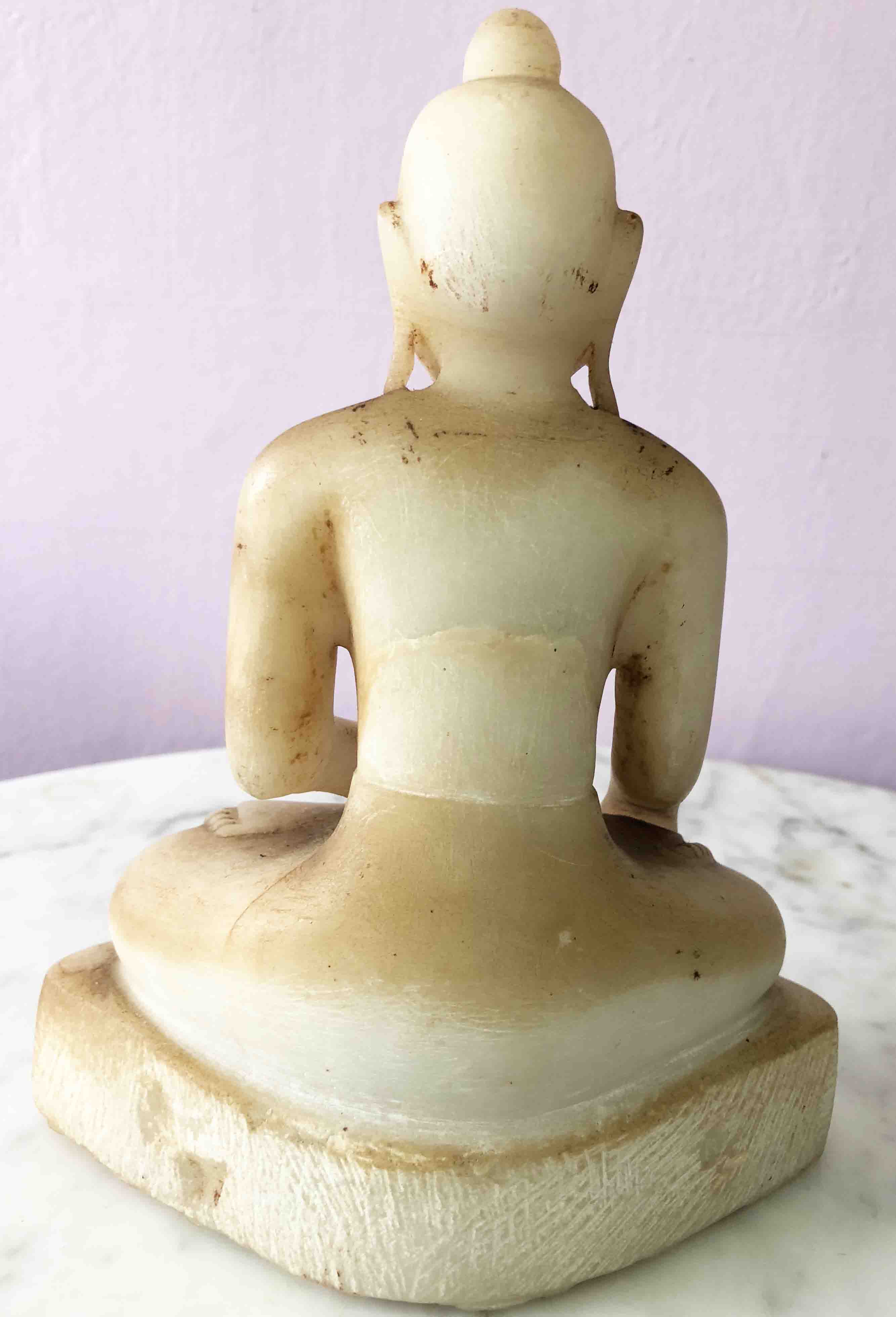 Alabaster was often used for Burmese Buddhas. The Burmese ones always have these charming, almost childlike features, often with a bit of a silly grin. After all, they have just conquered evil, time to feel a bit smug. Thai Buddha's take themselves more seriously.