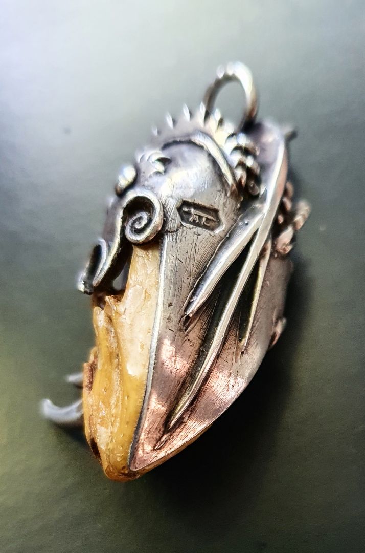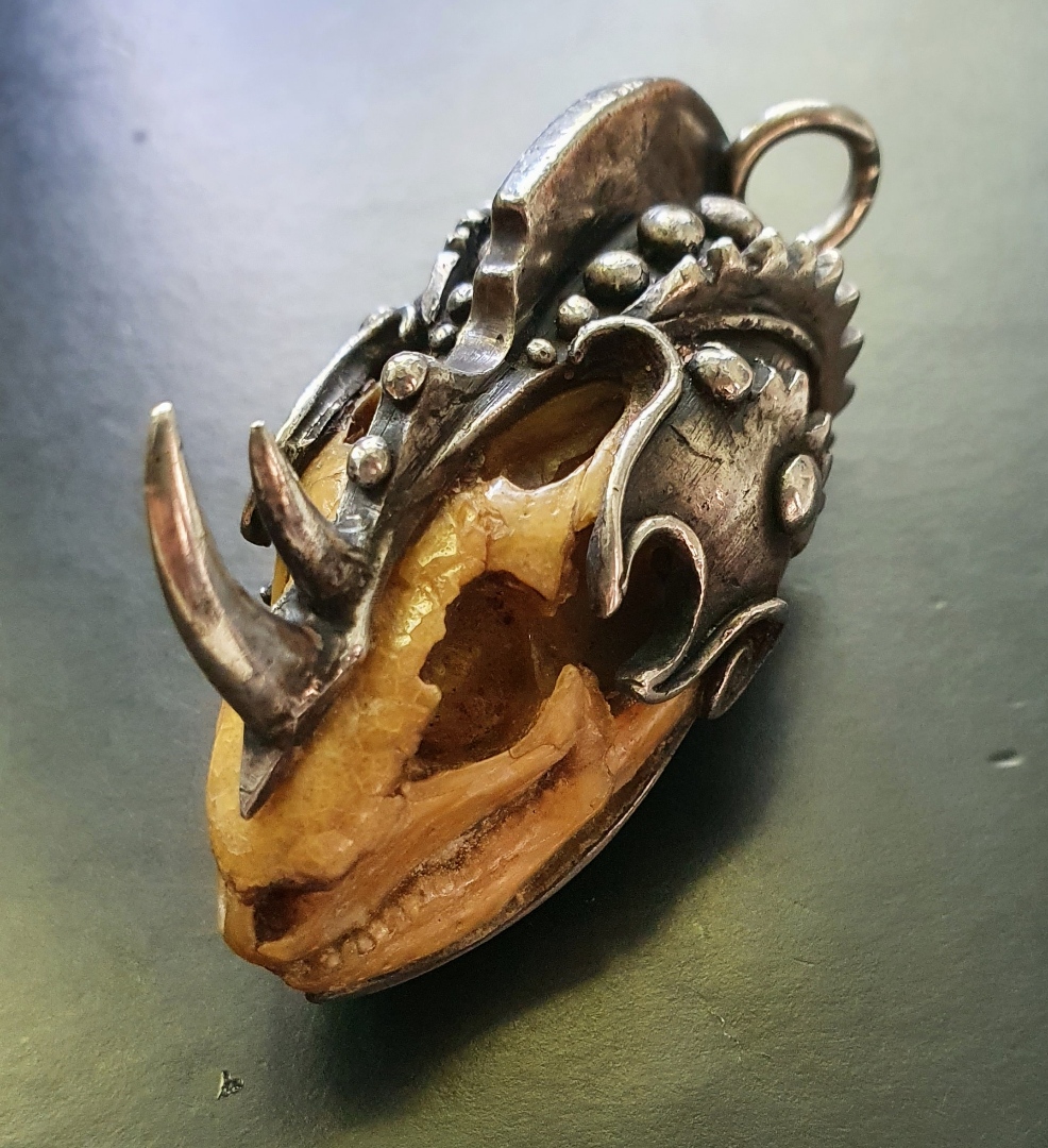 Featured Mysterious mark on big ethnic silver monted lizard skull pendant.