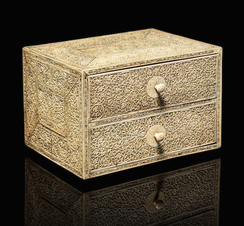 Finely carved ivory caskets produced in Ceylon during the Portuguese era in the 16th and 17th Centuries were highly sought after by Europeans. The Ceylonese workshops which specialised in ivory caskets, such as the present lot, produced their work in a style which assimilated traditional Sinhalese modes of decoration with those derived from European forms. Significant early examples of the type found their way into the collections of European royal and princely families related to the Portuguese Queen, Catherine of Austria. A related example in the Victoria and Albert Museum, known as the Robinson Casket was produced as a diplomatic gift to commemorate the King of Kotte's conversion to Christianity and the birth of an heir to the king of Portugal (see Anna Jackson and Amin Jaffer (edd.) Encounters, the Meeting of Asia and Europe 1500-1800, p. 86, no. 6. 10)