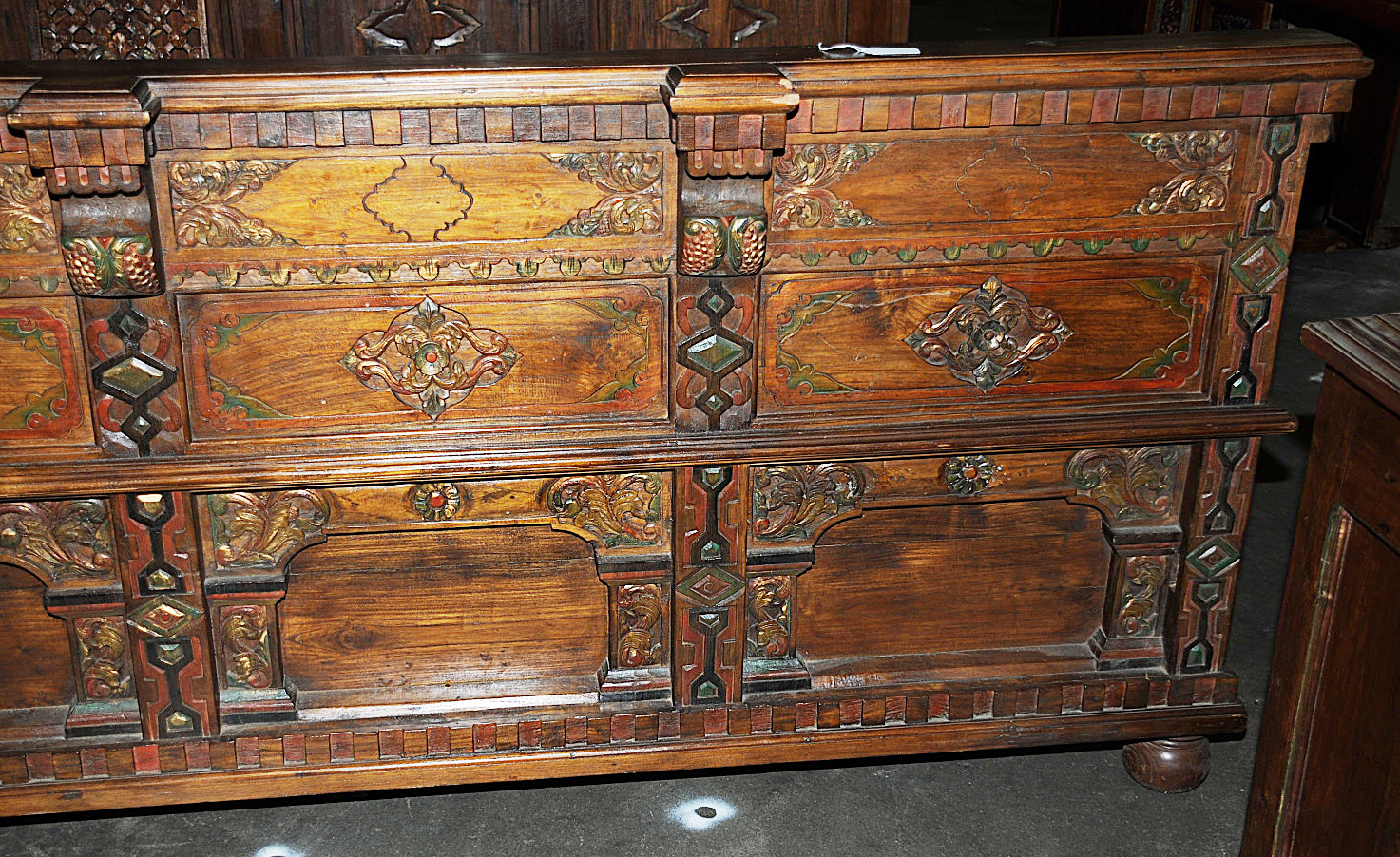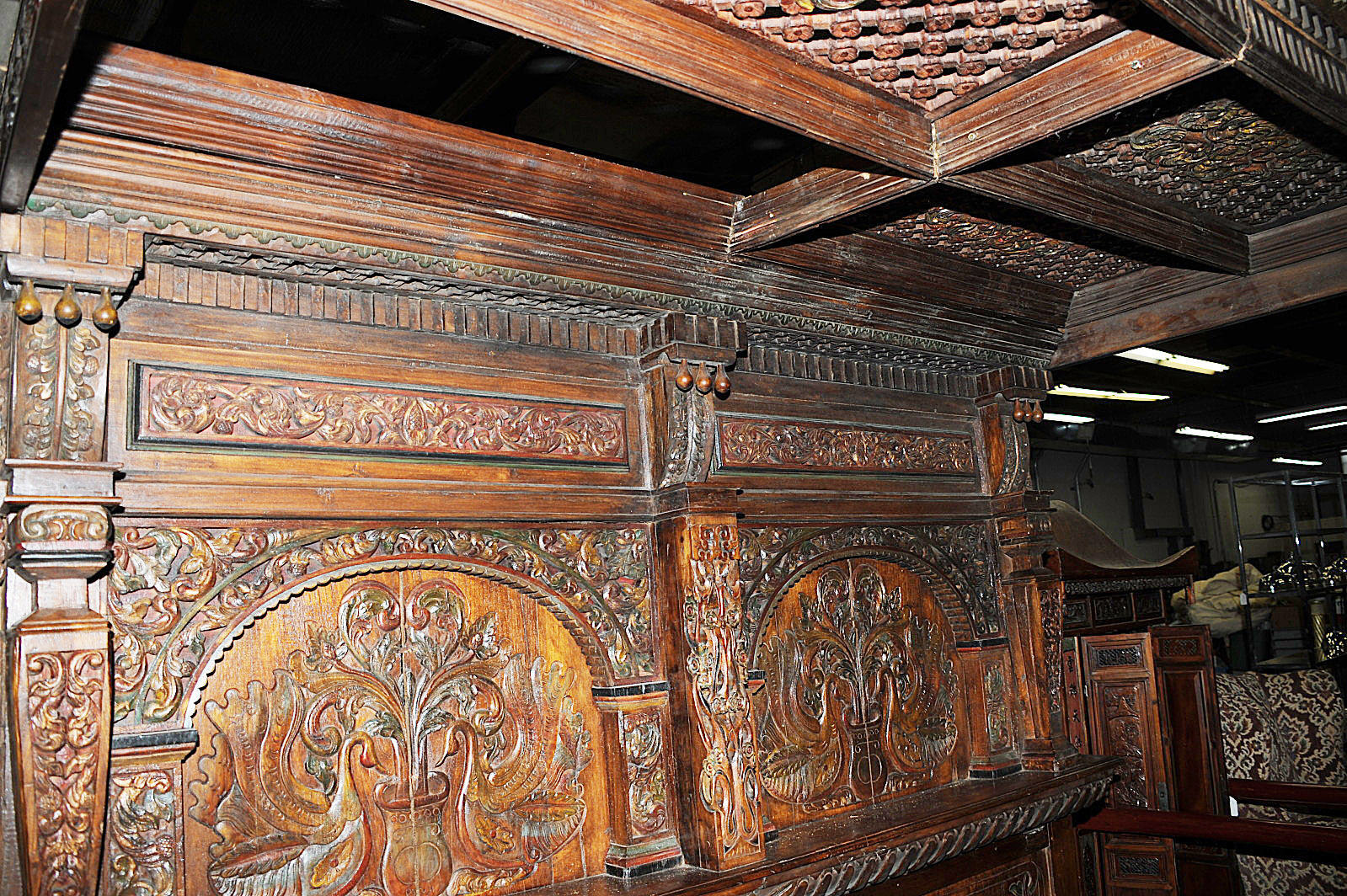 The bed is European in shape. That style lattice carving is very Indian. Peacocks are a classic Indian element. They are on either side of a flower vase, a representation of Kalpataru, the primeval tree which can grant wishes.