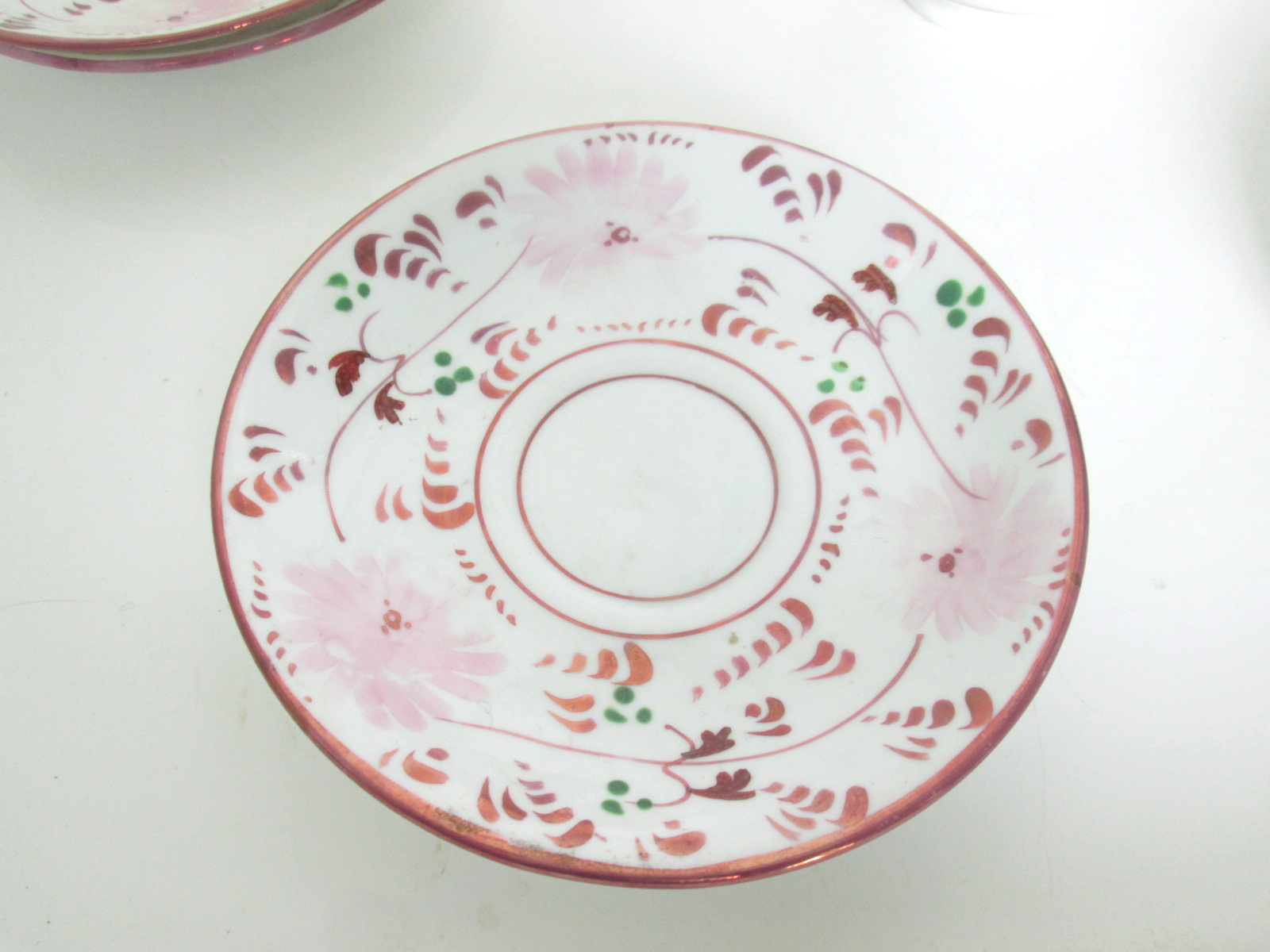 Featured pink lustreware teacups and saucers