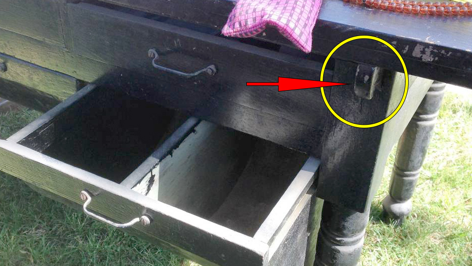 As to the name "Possum Belly," I had heard that name for for a type of **drawer** found in Baker's cabinets and not for the whole cabinet since I was young - born and raised in New England. In New England I never saw these type of drawers, but was acquainted with Hoosiers. The name always puzzled me for I couldn't image what it looked like. I didn't see such a table with "possum belly" bottom drawers until well into my adult years in the mid-south, and I bet I have only seen a couple. I have seen many in magazine, kitchen articles, etc. It seems to me only the drawers were called possum belly, not the whole cabinet/table.