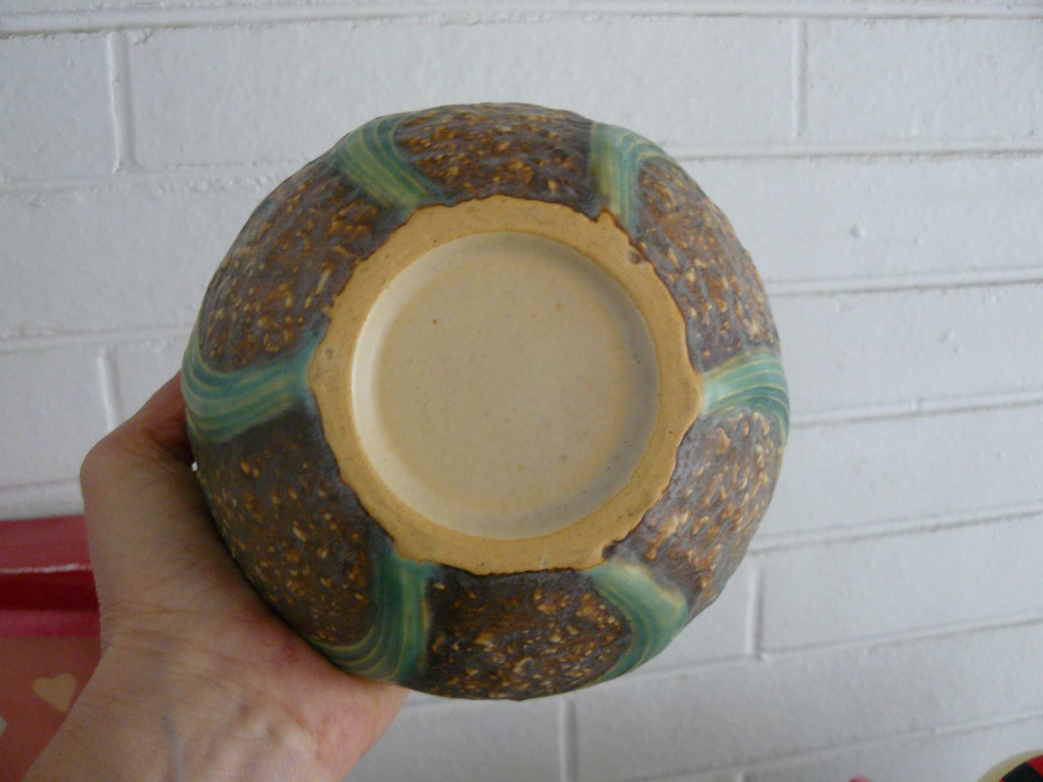 Also got a very pretty piece of unsigned daffodil (pretty sure Jonquil) pattern Roseville. Was looking up the daffodil piece once home and by chance saw some Roseville pieces that sort of looked like this unsigned brown one calling it Rozane.