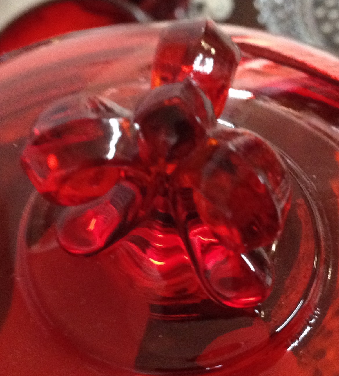 The green bowl is iridescent, kind of hard to capture in the photo. The ruby candy dish has a fleur de lis finial. Any thought are greatly appreciated. Thanks, Joe