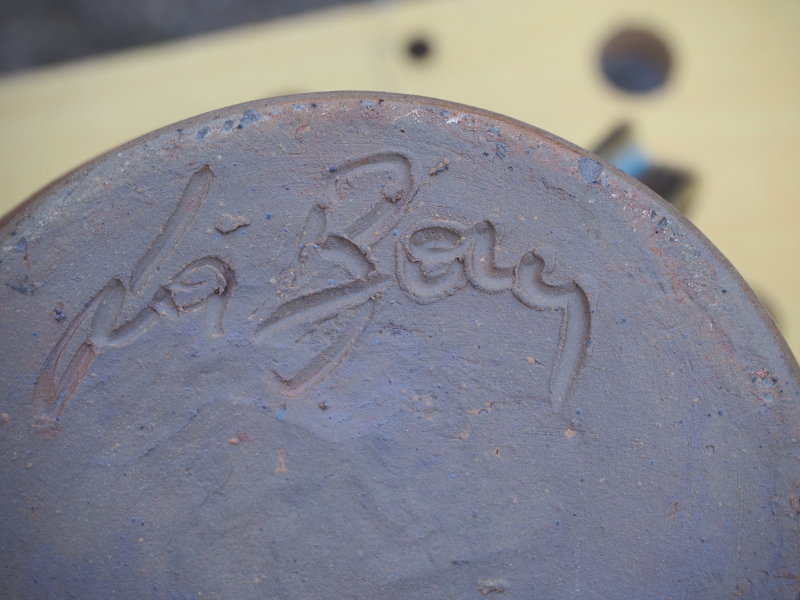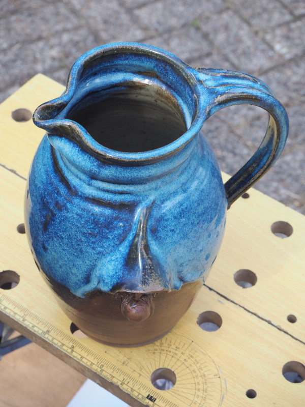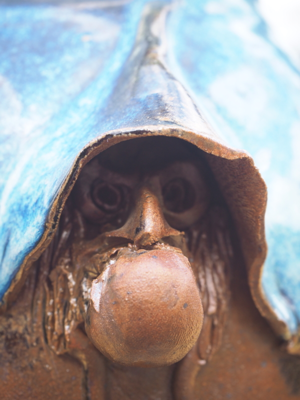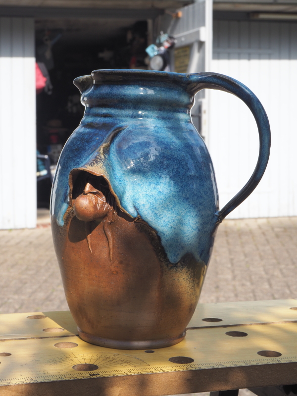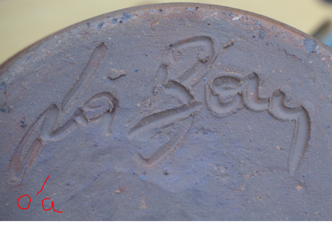 I bought the “Wizard’s Jug” at a local Flea Market in 2019 - I really like it, and I’d appreciate any information that you may be able to give me. It’s ca. 23cm high, brown clay with blue/green glaze and some of the clear glaze runs down the brown clay at the back and sides. A “grotesque” face looks out from the front, wearing a hooded cloak. I cannot see any damage at all, so well looked after... There is a “signature” etched into the base which seems to be French but I haven’t been able to get any luck from my g@@gle searches... As you have probably noticed, I am in no way an expert in ceramics, and therefore would be very grateful for any information /pointers /leads that you are able to give me. Thanks. PS.I noticed a whiteness in the close-ups of the face, it just sunlight reflection, the face is uniformly brown.