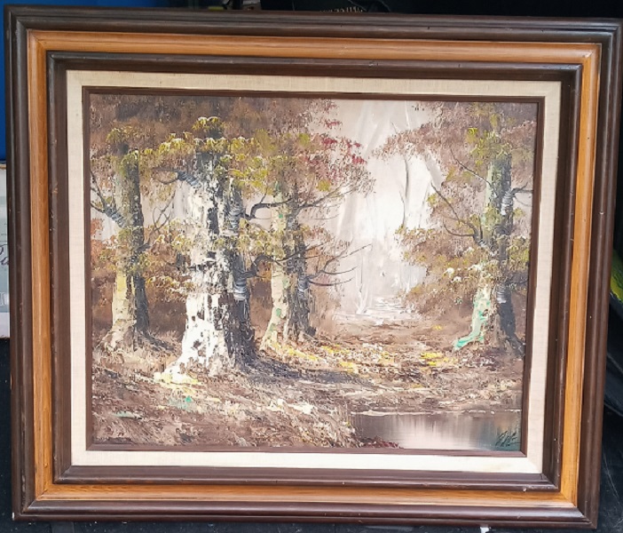 This medium sized oil on canvas is initialed bottom right. Think this is surely factory art. Bought for $5.00.