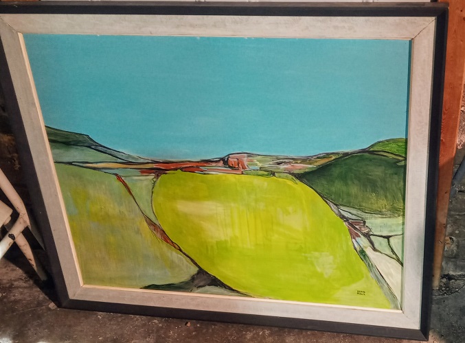 This is my best find and a keeper for me. It is by central IL artist Elvin Mauk (1929-2006). I have dealt with a number of his works over the years including about 20 I bought from his estate. I have not kept any until now. It is fairly large oil on canvas and probably one of his earlier abstractions. I had to pay a whole $40.00 for this but did not blink an eye. Apparently others did, as I did not see it until the third day it was in the store. Store employee told me that many people looked at it but did not buy it. :confused: I sold several of his abstract works in the $400-$600 range in the past so a no-brainer for me.